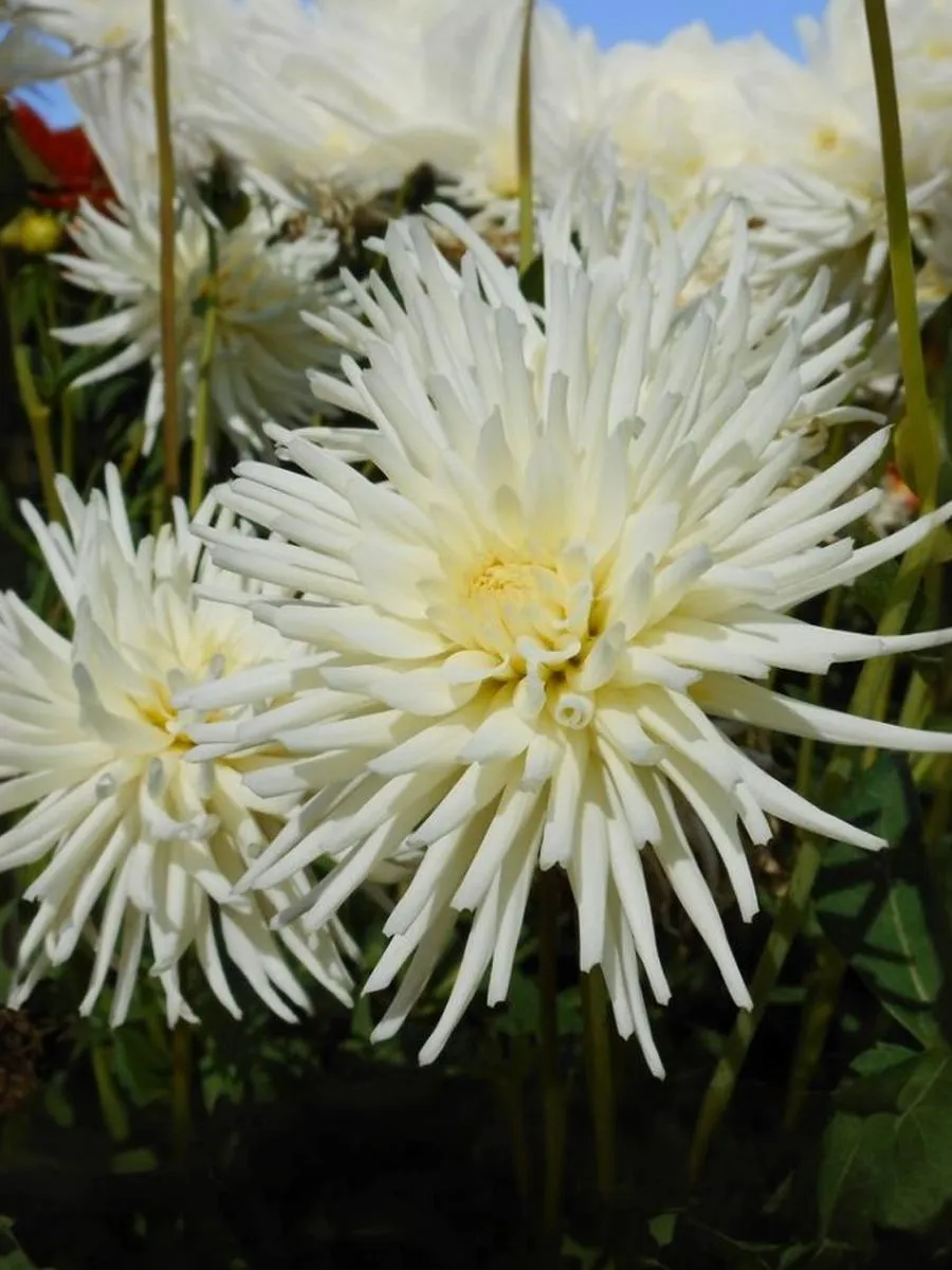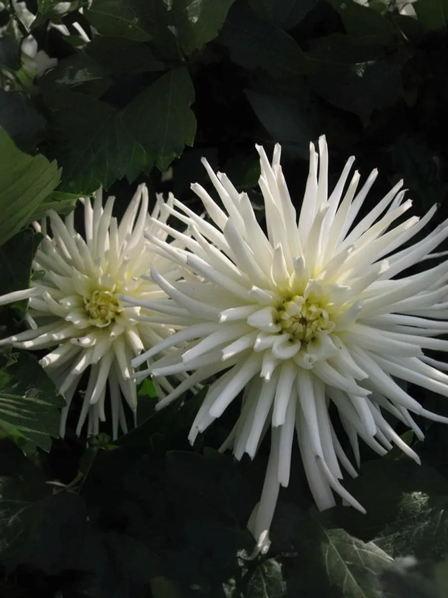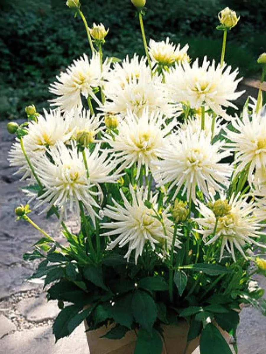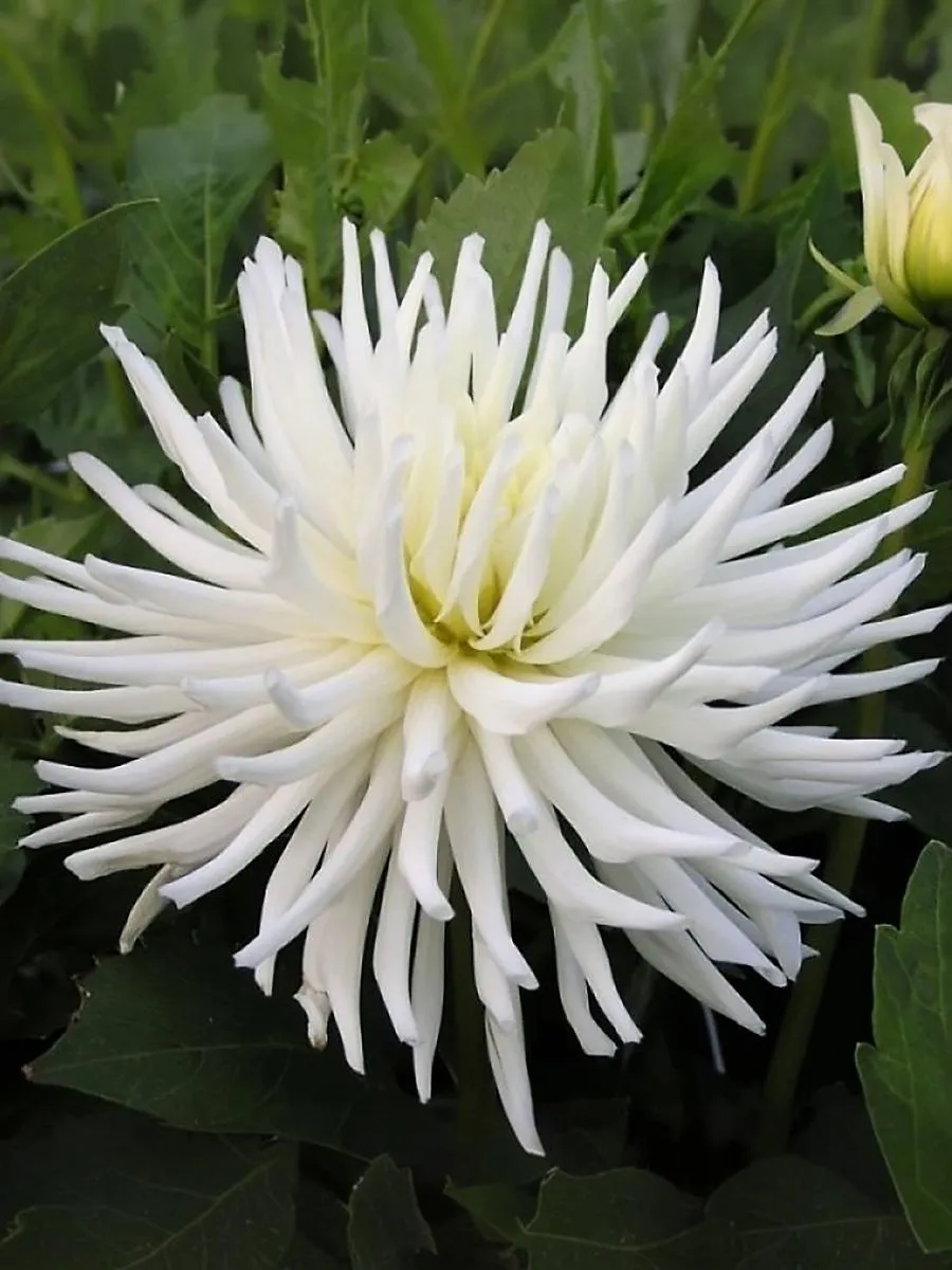 Белый кактусовидный низкорослый георгин имеет компактный куст, специально предназначен для оформления бордюров и вазонов. Стебли прочные не требуют подвязывания к опоре, листья темно-зеленого оттенка, идеально контрастируют с белыми цветами "ежиками". Высота: 30-40 см Диаметр цветка: 10-12 см.