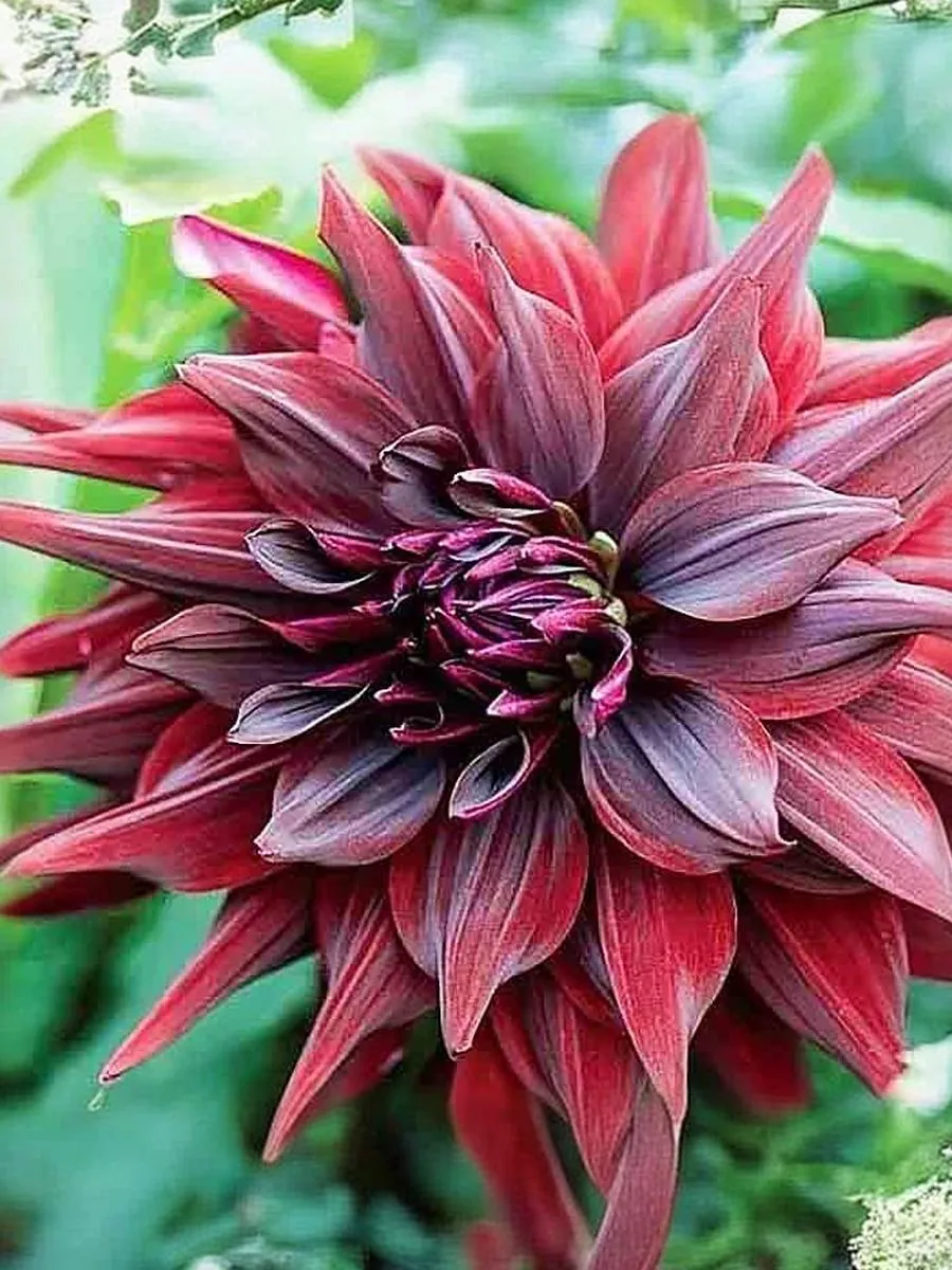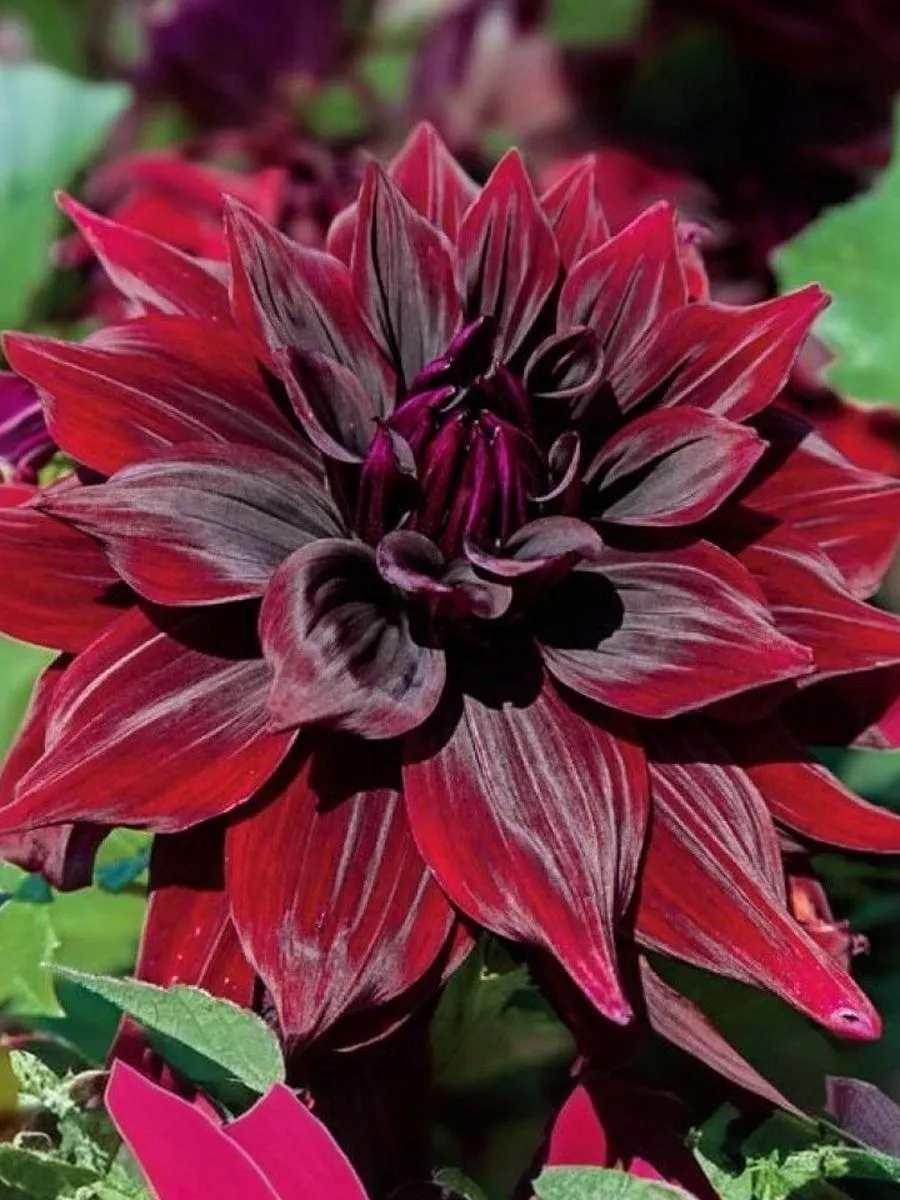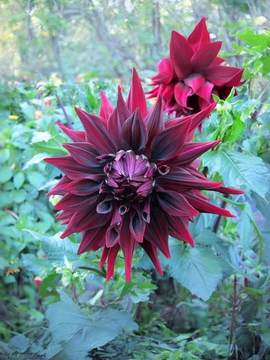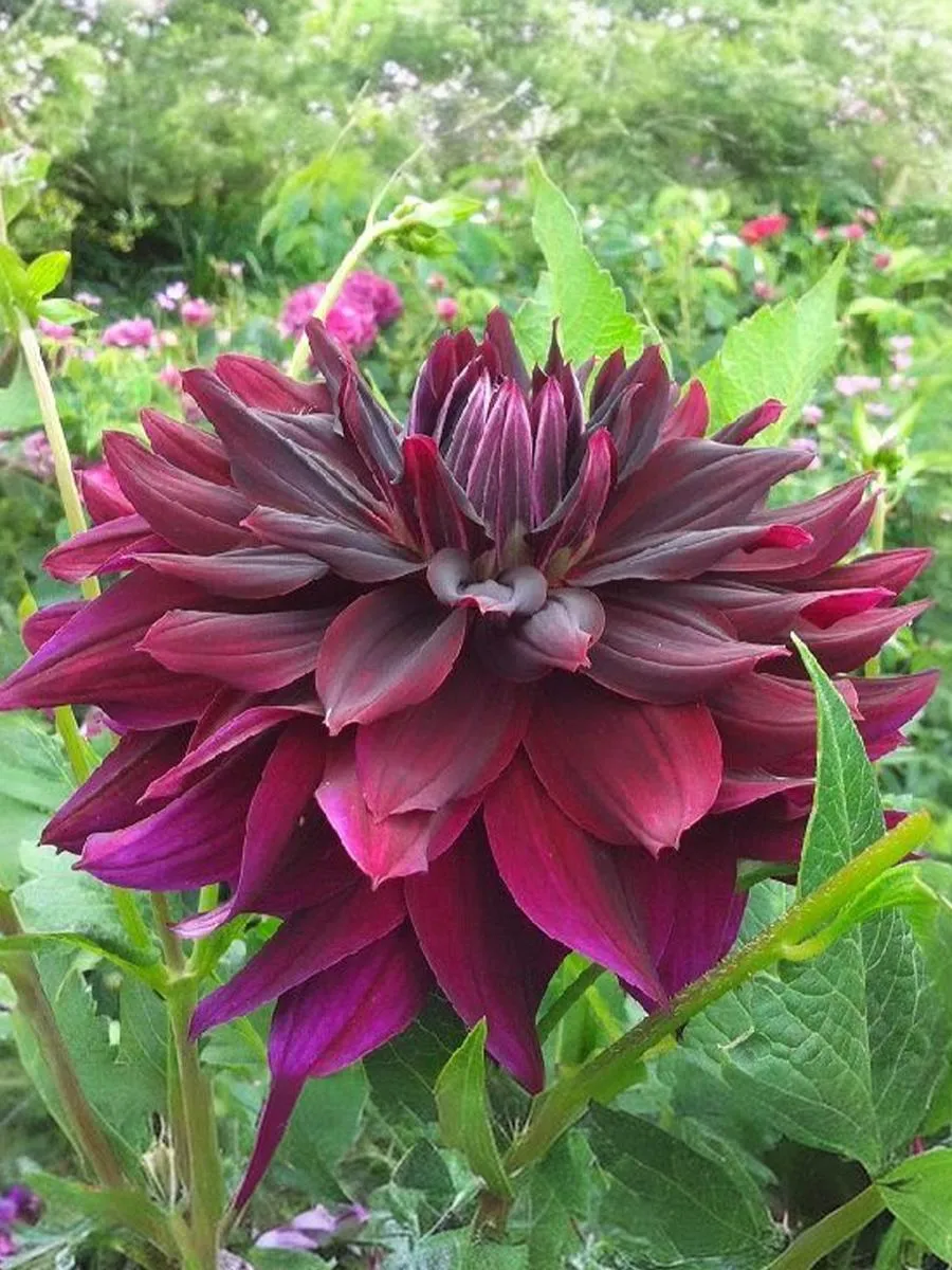 Исключительно эффектный сорт! Цветки крупные, махровые, насыщенного бордового оттенка с очень темным центром. Лепестки длинные, слегка загибаются наружу, что придает бутону дополнительный объём. Высота: 100-150 см Диаметр цветка: 20-22 см.