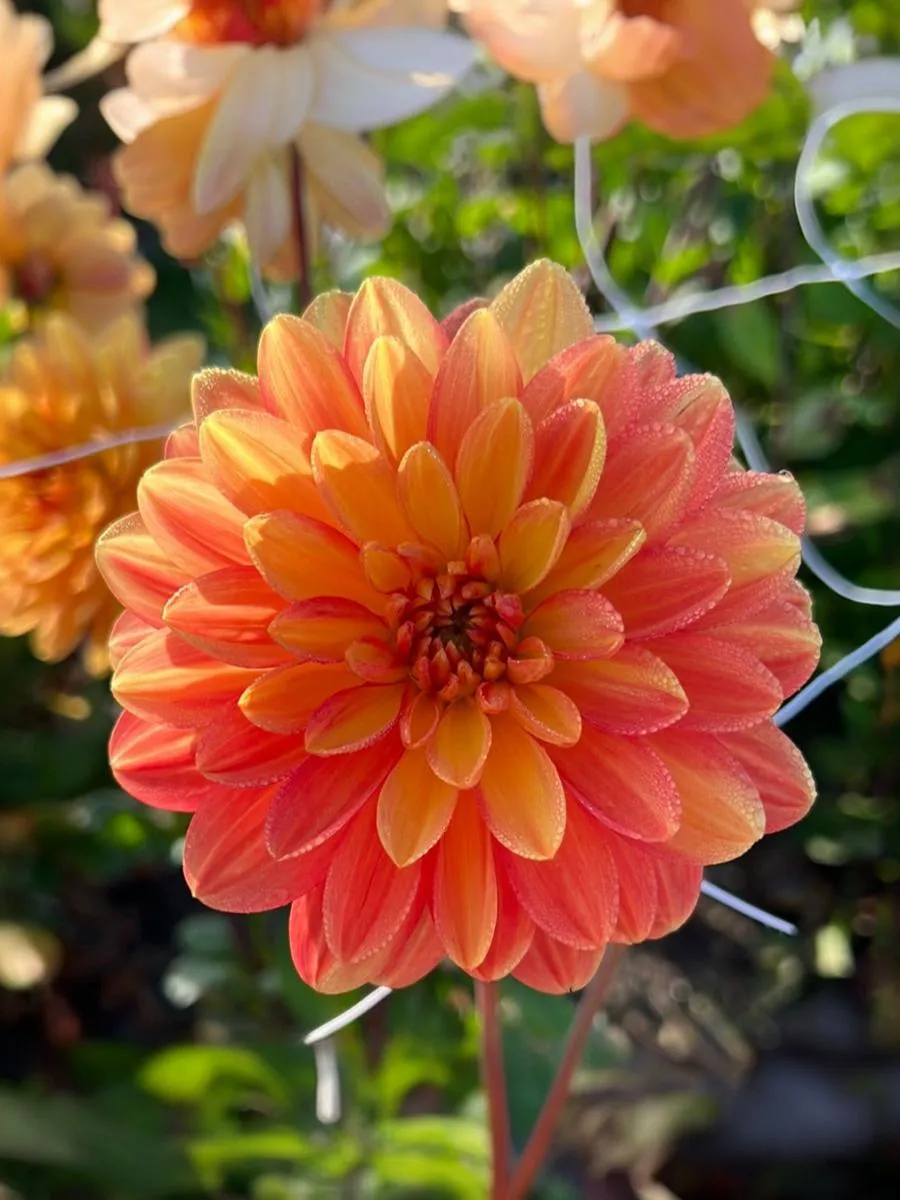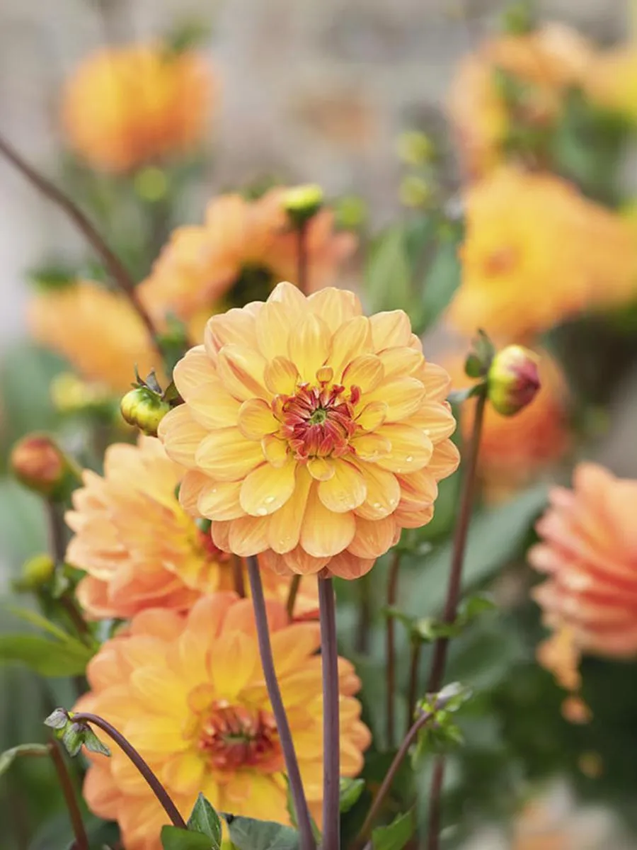 Георгин с очень приятной желтой окраской цветков, который по внешним краям лепестков переходит в теплый абрикосово-розовый тон. Когда бутон только распускается, его цвет более насыщенный, чем старше он становится, тем светлее. Цветки одного и того же растения иногда могут иметь разную окраску. Высота: 80-100 см. Диаметр цветка: 10-15 см.