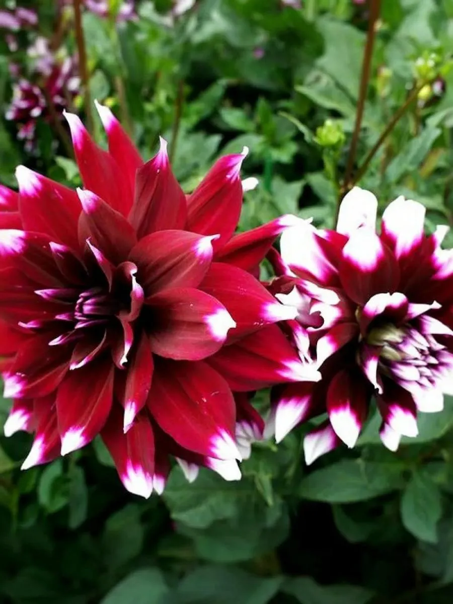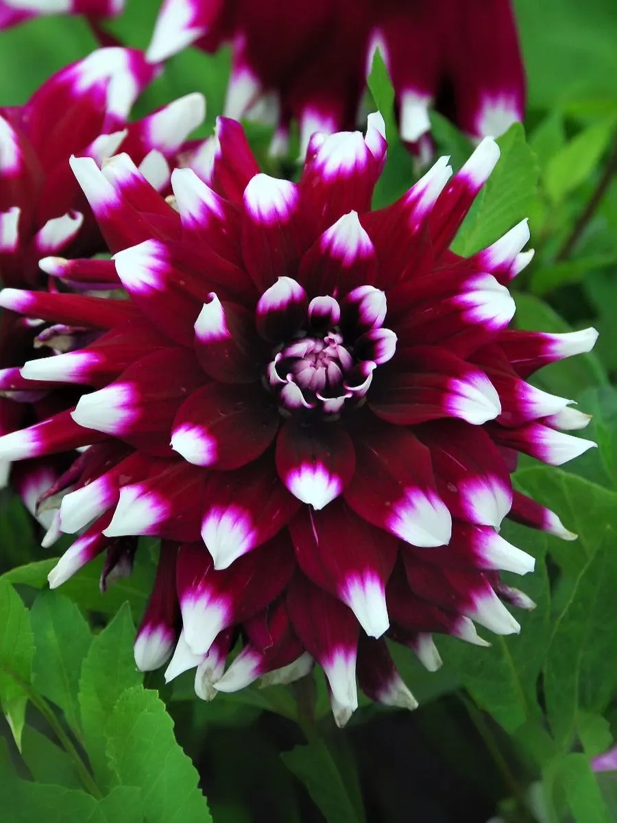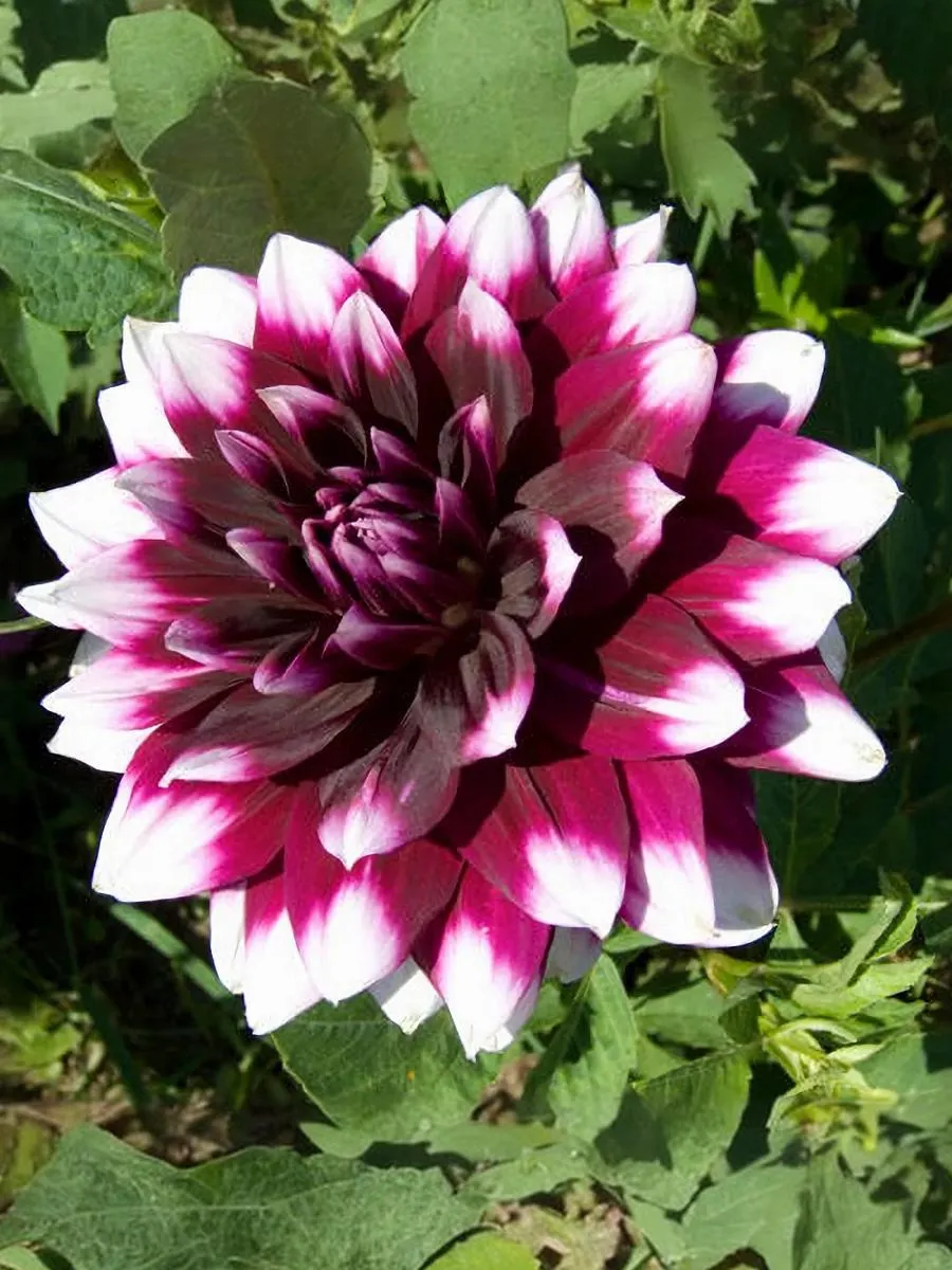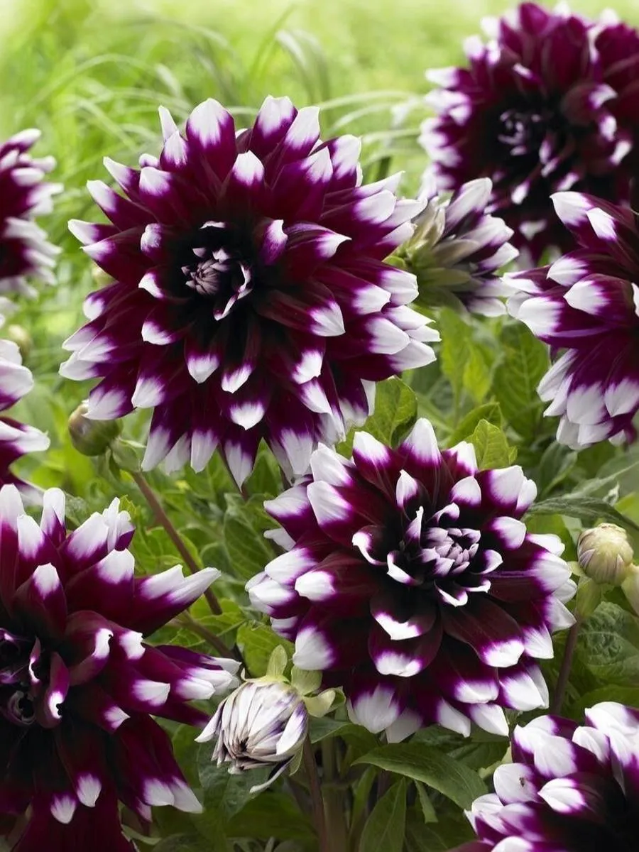 Декоративный невысокий георгин с крупными цветками. Яркая и привлекательная окраска лепестков, темно-сливовое основание и белые кончики. Отлично подходит для украшения бордюров и клумб. Соцветия напоминают фантастические огромные хризантемы. Глубокий фиолетовый цвет лепестков оттеняют белоснежные кончики. Сочетается с любыми цветами в саду и на клумбе. Высота: 70 см Диаметр цветка: 15 см.