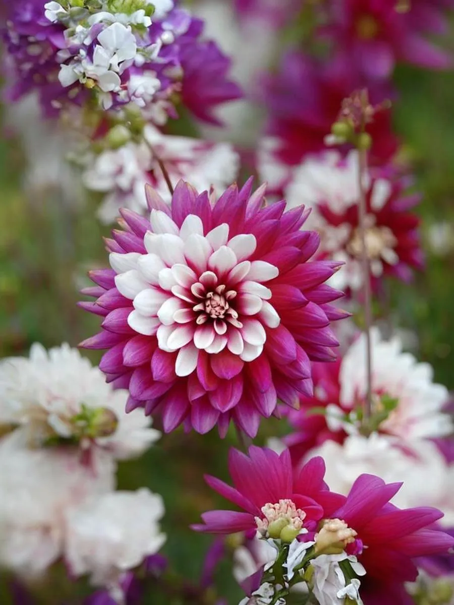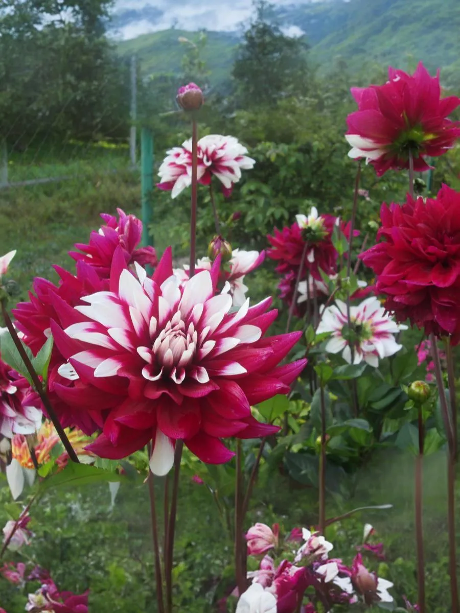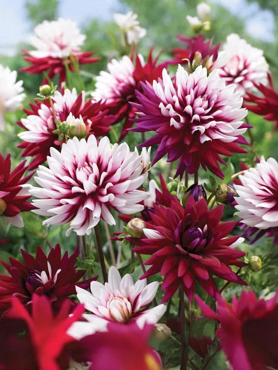 Цветки георгина Ребеккаc Ворлд имеют шаровидную форму и достигают в диаметре до 20 сантиметров. Они отличаются насыщенной бордово-красной окраской с белыми кончиками лепестков, создавая эффектный контраст. Цветение начинается в июле и продолжается до первых заморозков. Георгина достигает высоты от 70 до 120 сантиметров, образуя пышные кусты с крепкими, прямостоячими побегами.