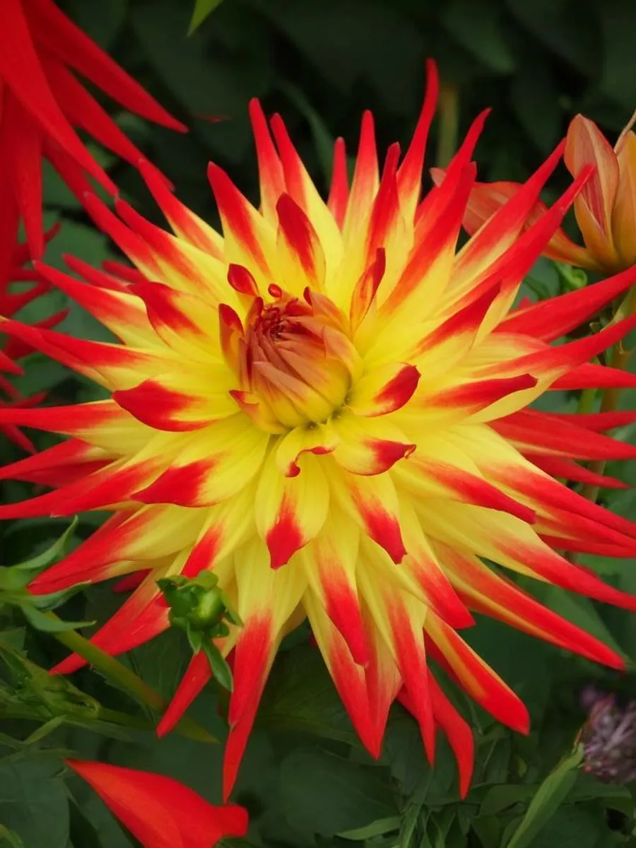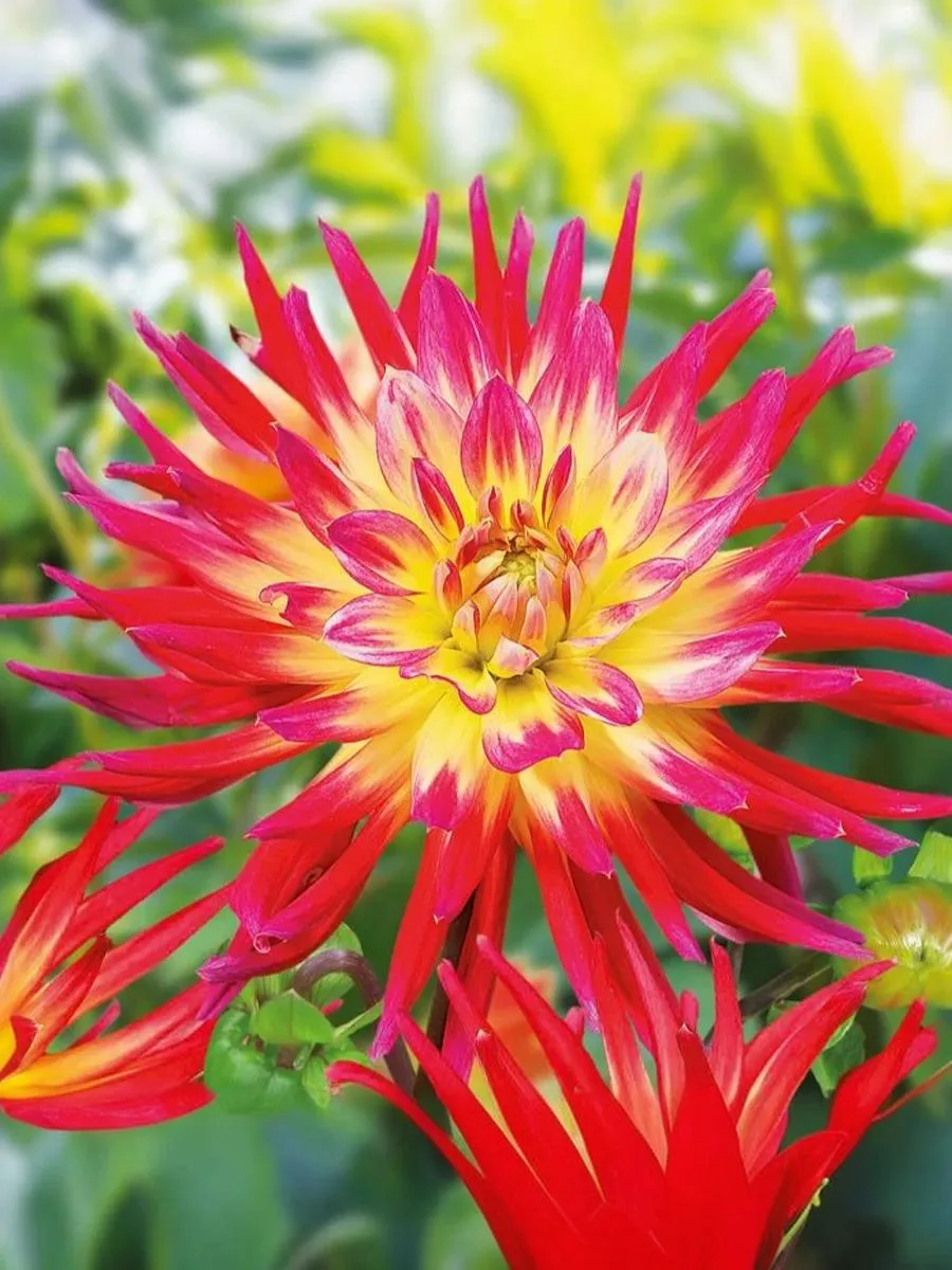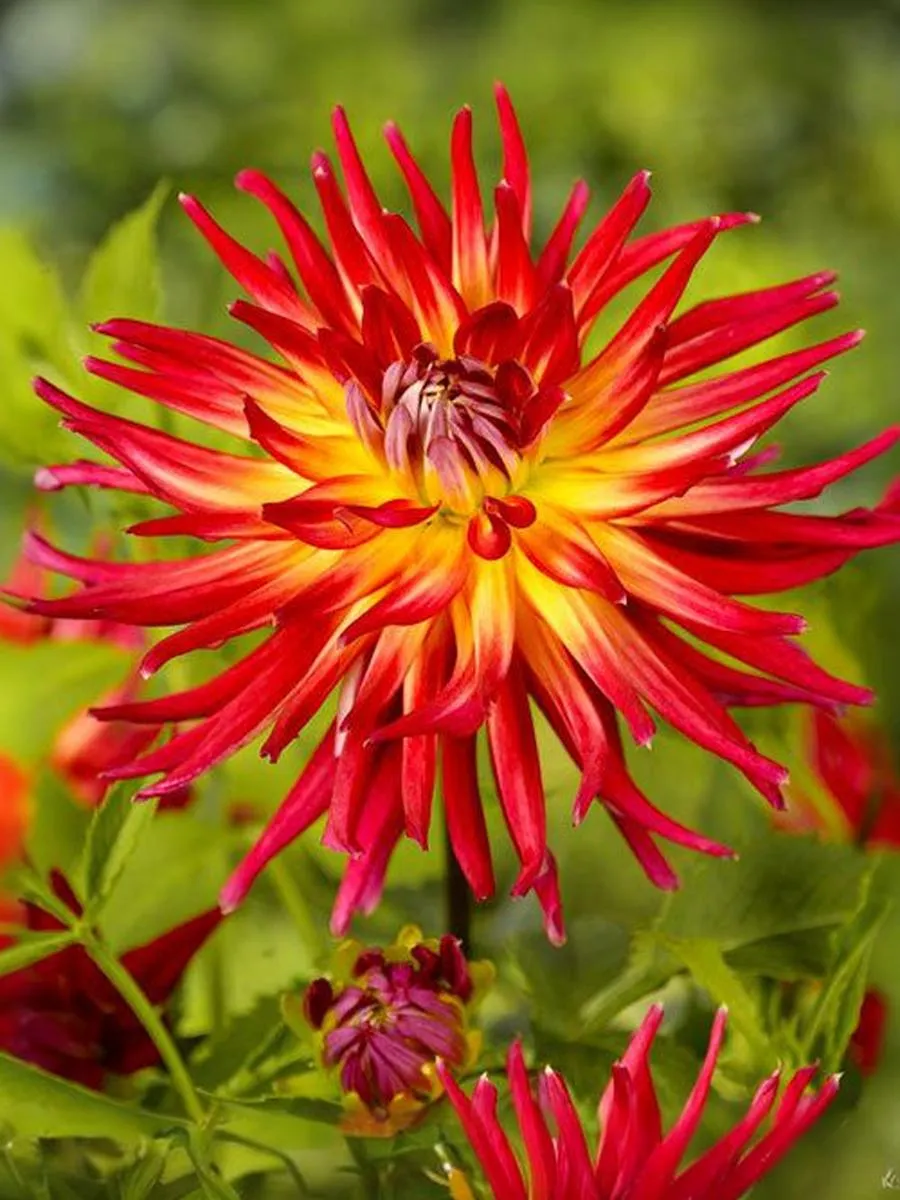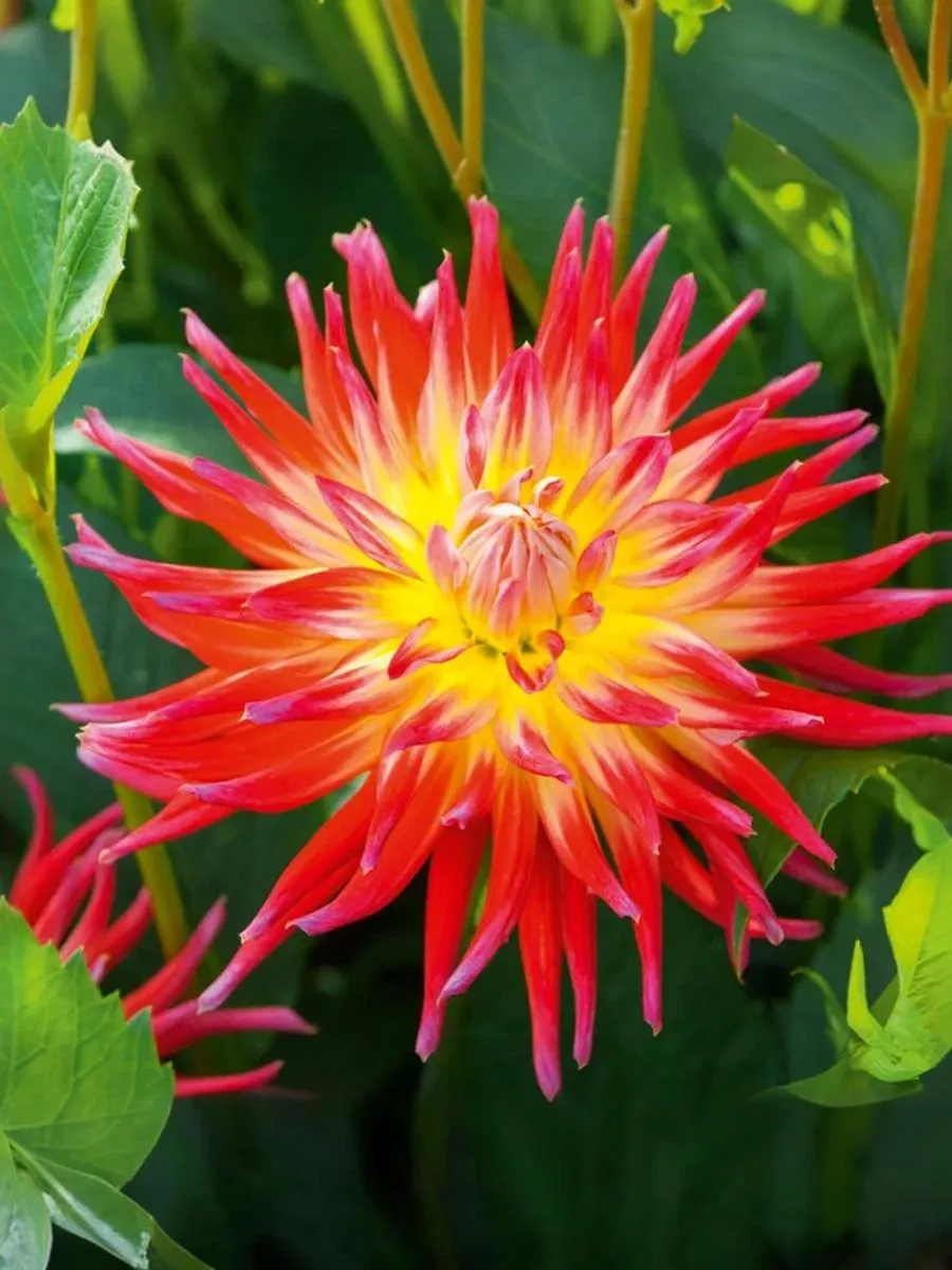 Георгин Бора-Бора является прекрасным представителем кактусовидных георгин, с длинными узкими изогнутыми лепестками, которые придают ему вид таинственных подводных актиний. Листва тёмно-зелёная. Цветки диаметром до 20 см, желтые в центре с постепенно меняющиеся на оранжево-красный на кончиках лепестков. По мере цветения окраска светлеет. Отличная срезка! Высота куста: 90-110 см. Диаметр цветка: 15-20 см.