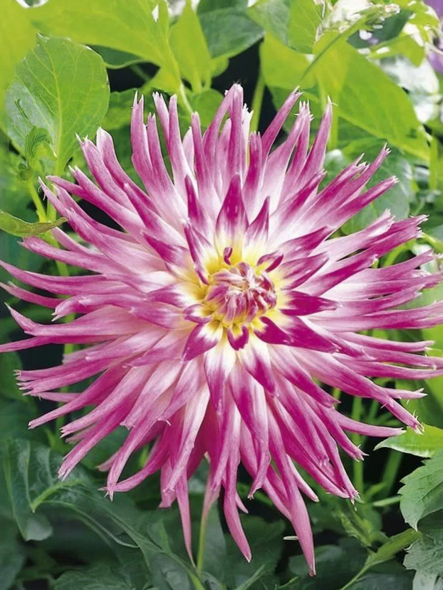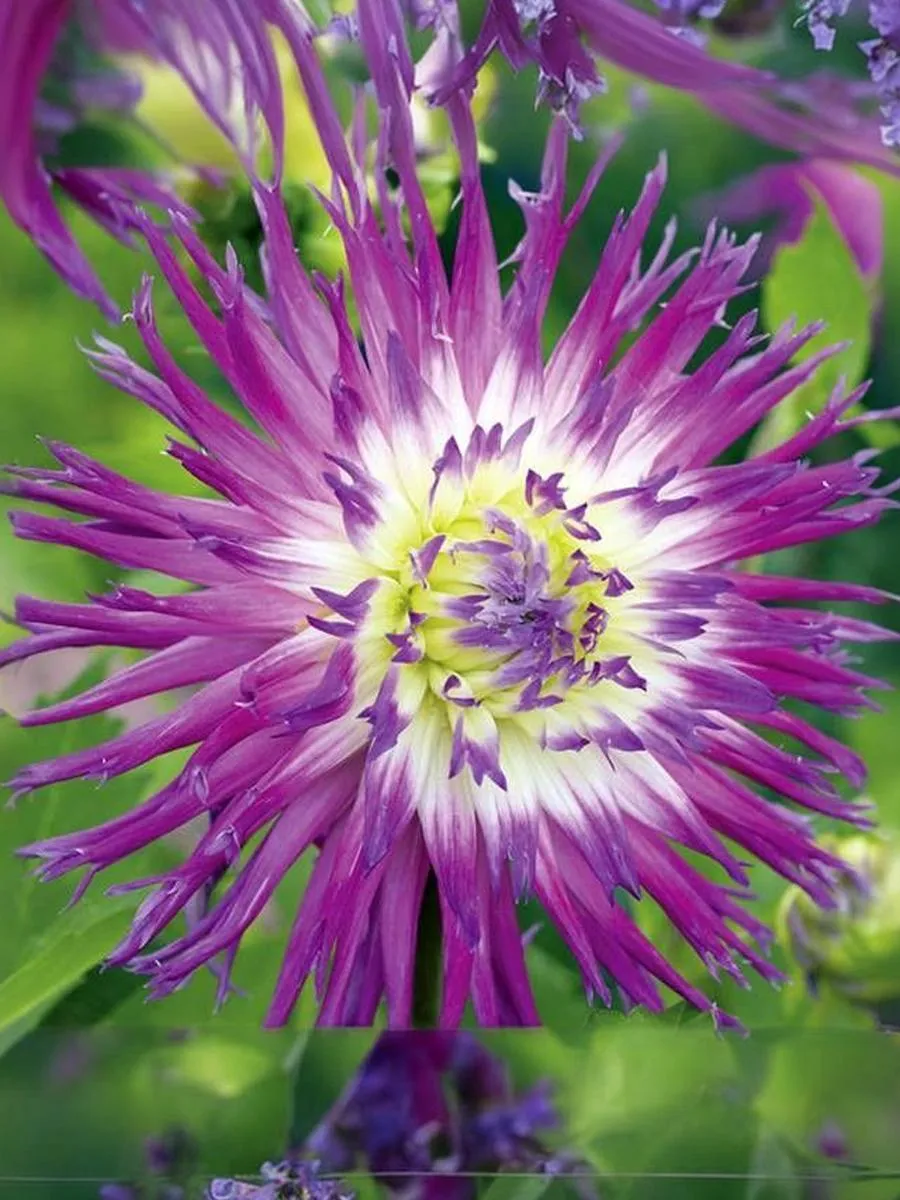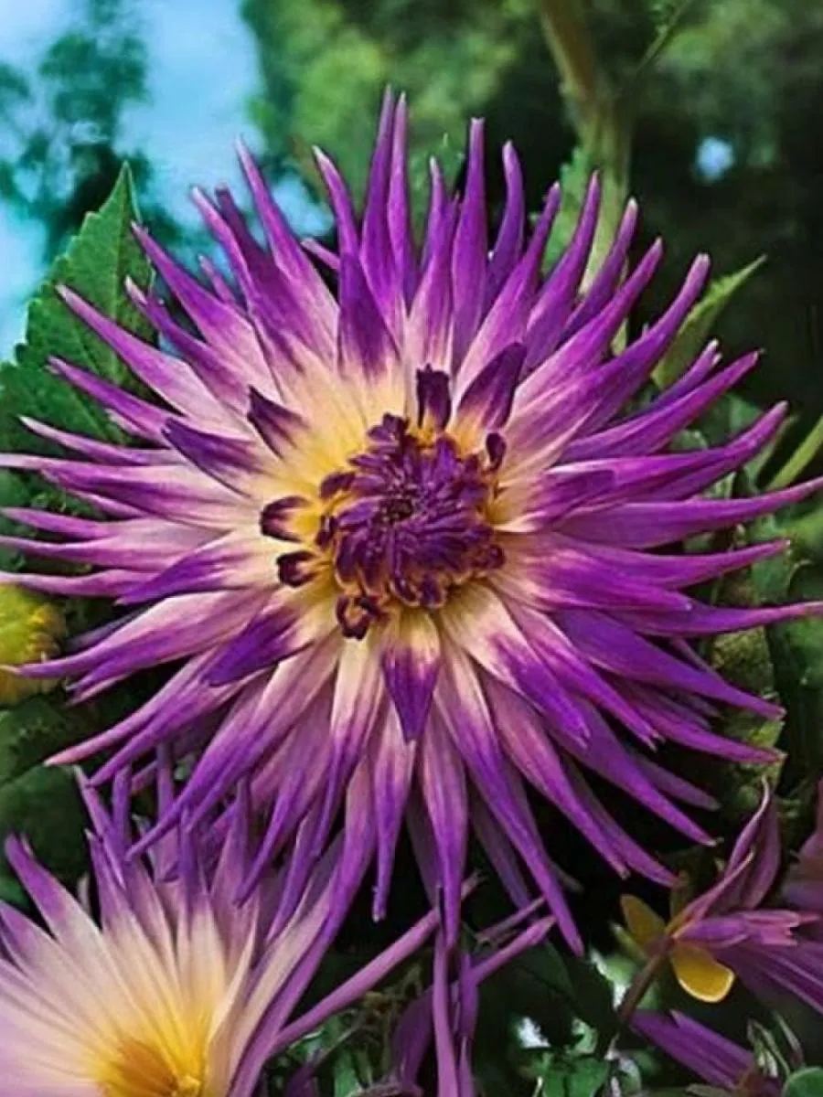 Георгин Веритейбл – необычный полукактусовый сорт с яркими оригинальными соцветиями! У основания лепестки имеют кремово-белую окраску с жёлтым бликом, а кончики светятся насыщенным сиренево-пурпурным оттенком! Лепестки закрученные, заострённые. Формируют окружность, в центре которой располагается нераскрывшийся плотный клубок лепестков. Он медленно раскрывается, что выглядит сверхоригинально. Цветовая палитра напоминает северное сияние. Высота куста: 100-110 см Диаметр цветка: 15-20 см