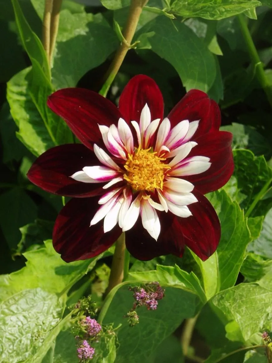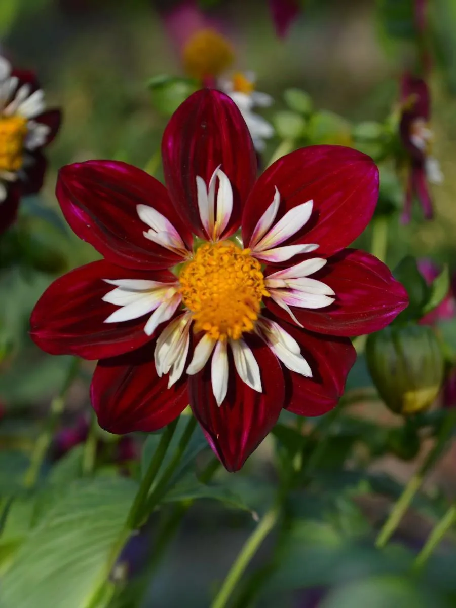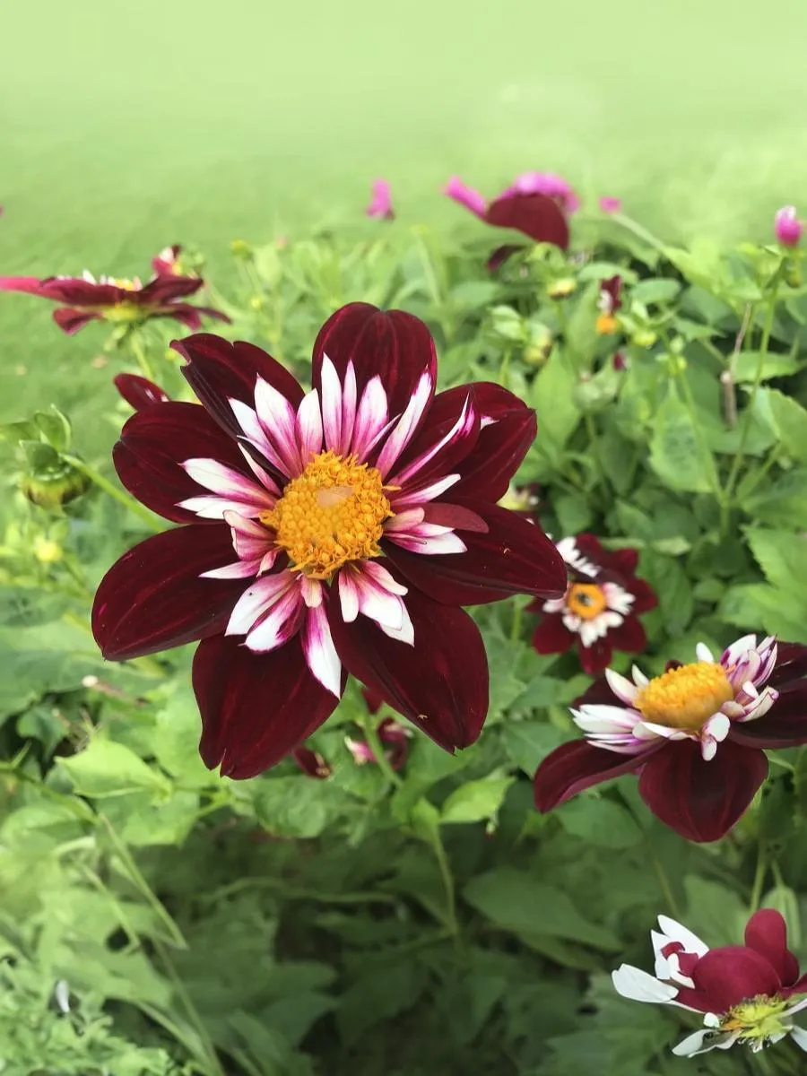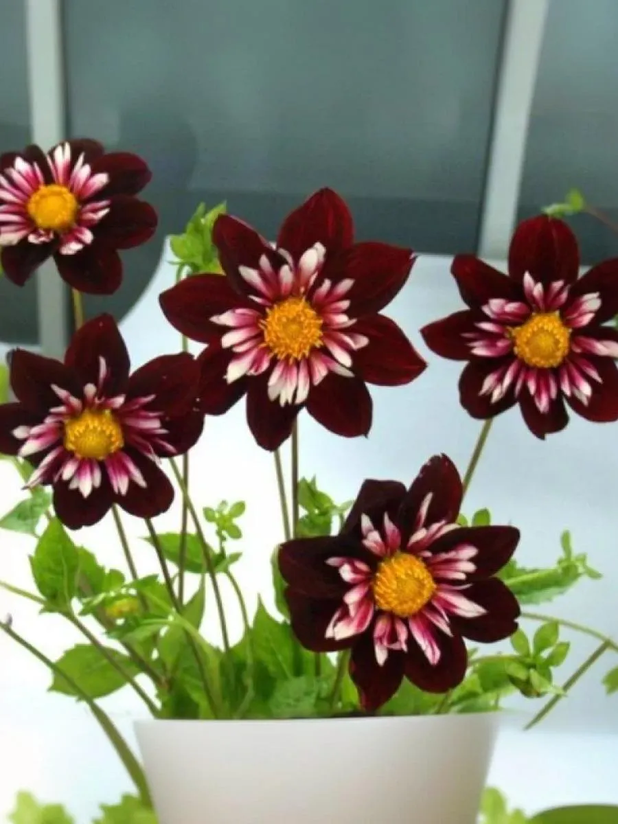Георгин Найт Баттерфляй был выведен в Нидерландах в 2006 г. Серединка цветка состоит из множества трубчатых лепестков желтого цвета. Цветки темно-бордовые с белым центром и желтыми тычинками.. Напоминает разветвленный куст, усыпанный миниатюрными соцветиями, диаметром всего 7-10 см, больше напоминающих ромашки. Цветение начинается в июле и продолжается до октября. Высота 100 см.
