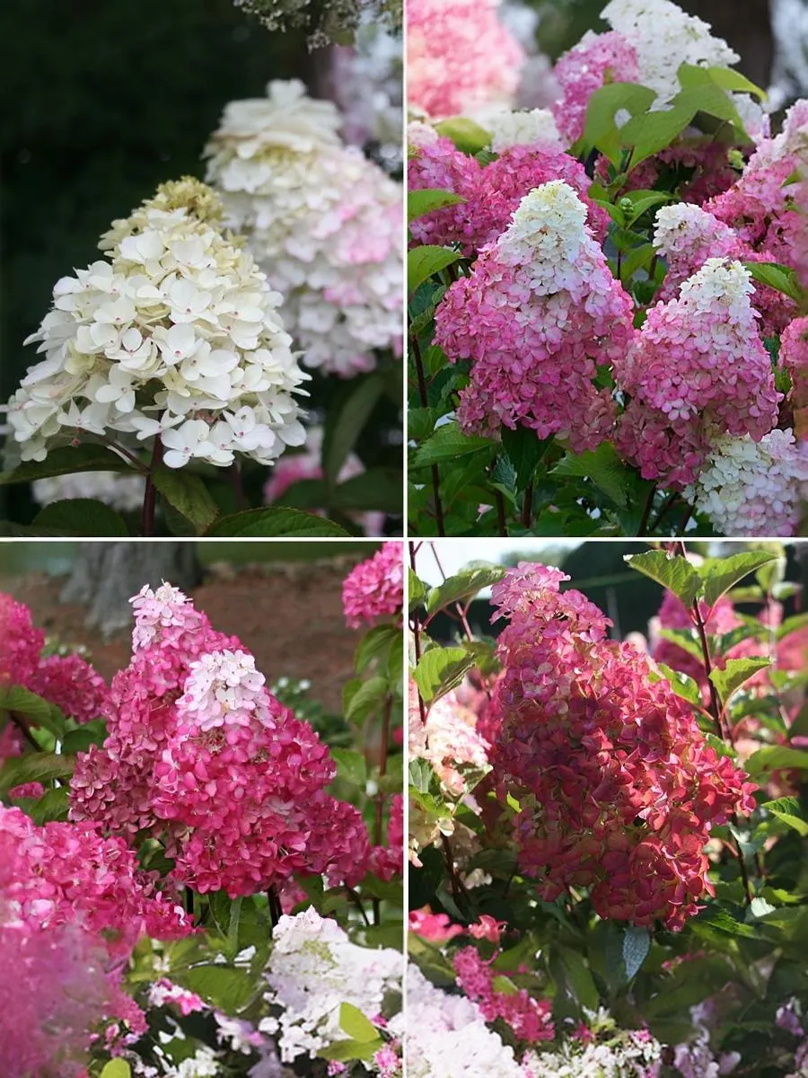Цветки гортензии Фрайз Мельба собраны в очень крупные соцветия пирамидальной формы. Обычно в длину они бывают до 40 см. Сначала цветки имеют молочно-белый оттенок, но постепенно розовеют и со временем становятся винно-красными. Верх соцветия долго остается белым, тогда как его низ приобретает яркий красноватый оттенок. Цветение кустарника начинается в середине июля и может продолжаться до первых заморозков. Этот сорт отличается очень длительным цветением и долго оживляет ландшафт яркими красками.