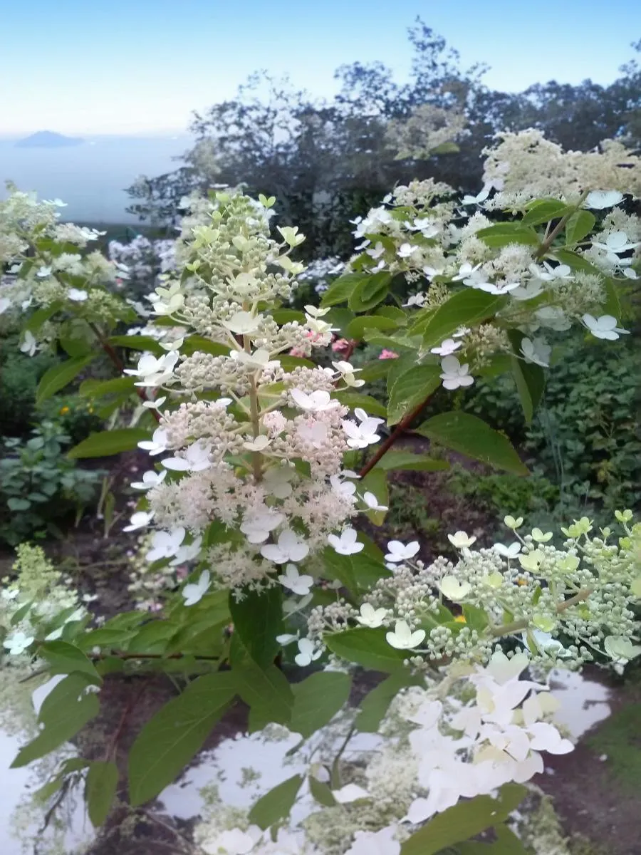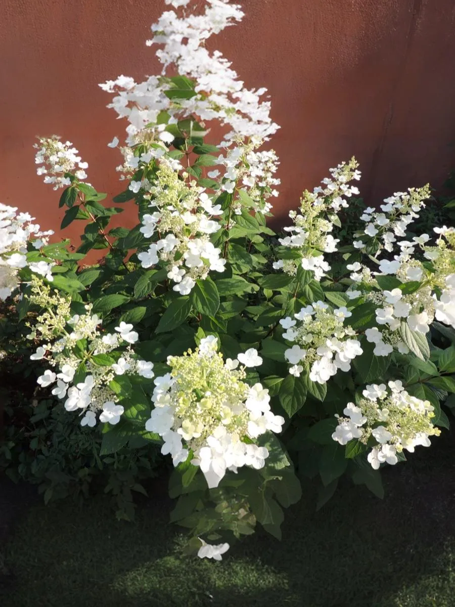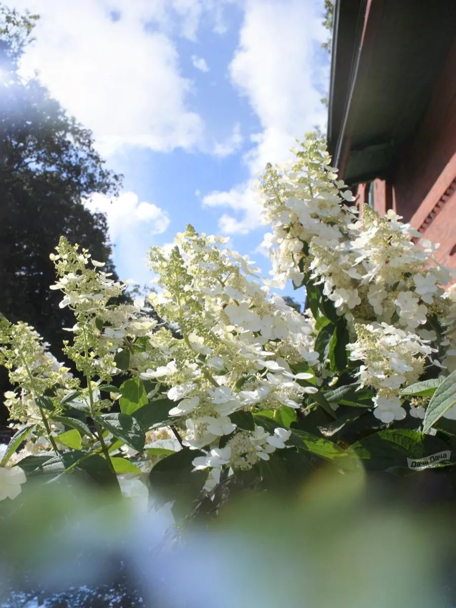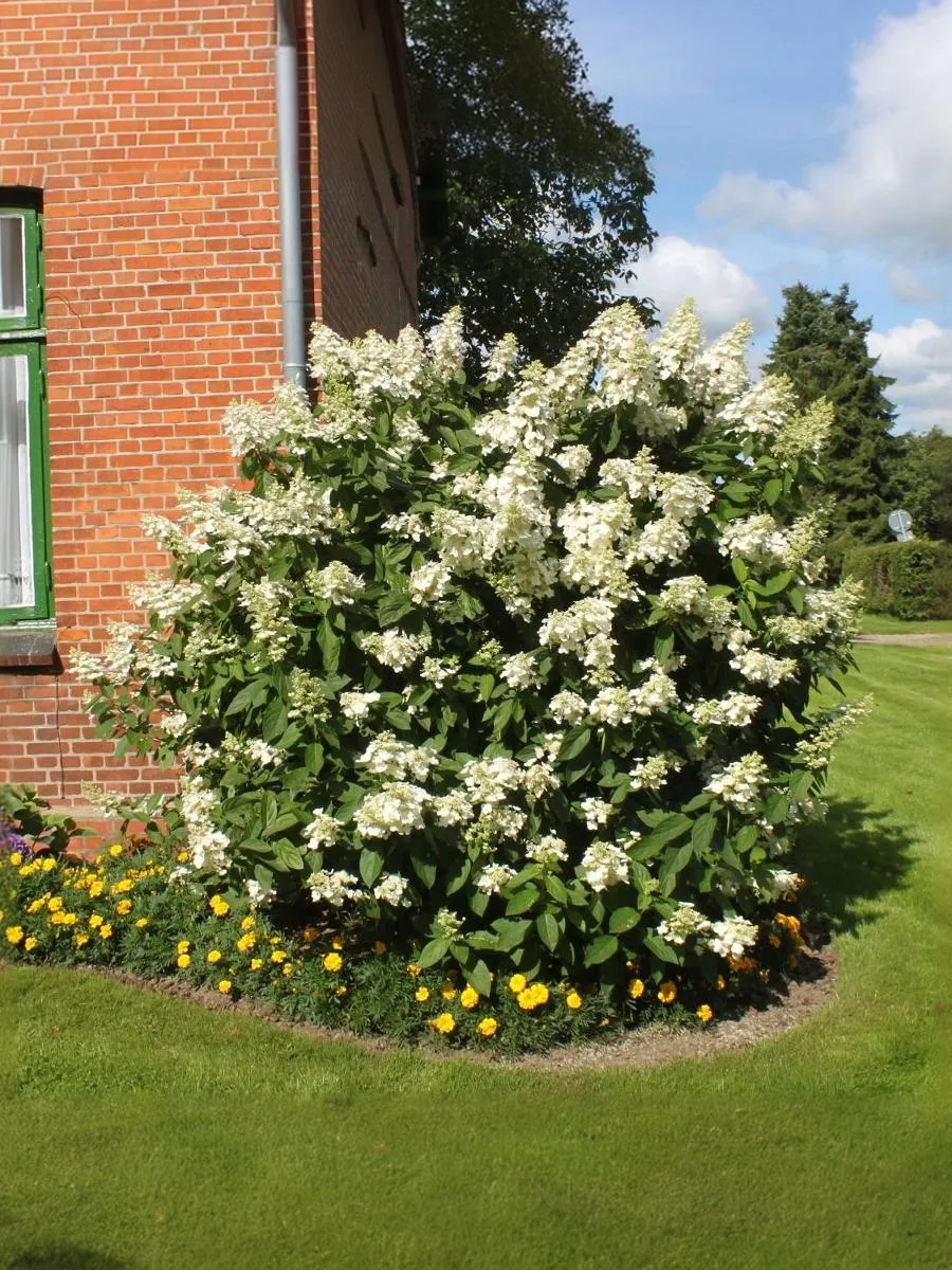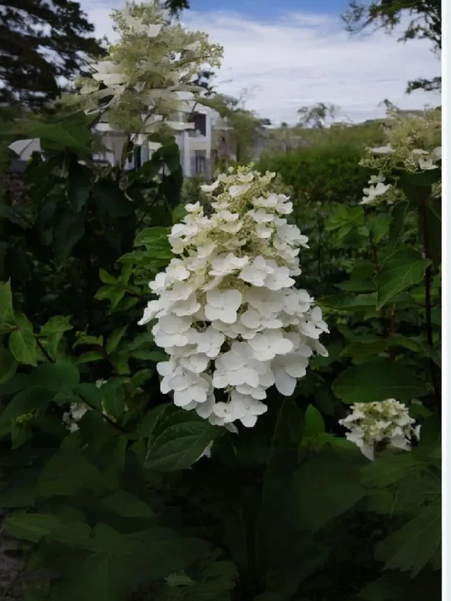 Соцветия у данной гортензии – крупные метелки 30-35 см в длину, имеют пирамидальную форму. Цветки белые на протяжении всего сезона с приятным ароматом, собраны в длинные и широкие конусообразные соцветия диаметром 10-12 см. прекрасно растет как на солнце, так и в полной тени. Цветение обильное и продолжительное. Разрастается в очень мощные, крепкие кусты.