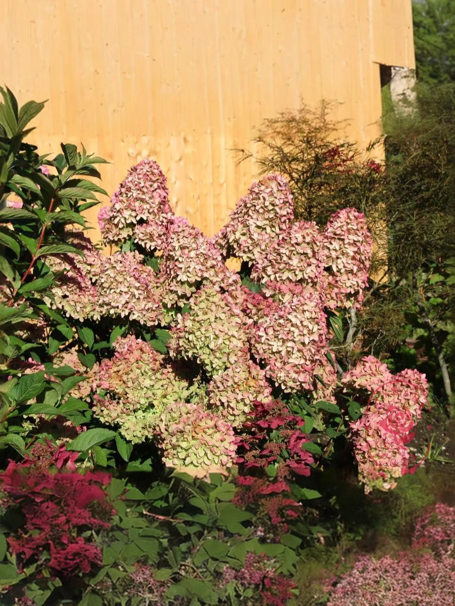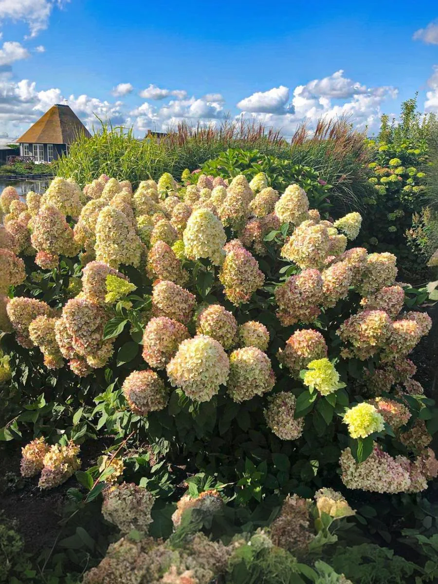 Куст компактный, сильно разветвлённый, крона густая, цветёт обильно в июле-сентябре, цветки бело-кремовые с зеленоватым оттенком, осенью красноватые, собраны в очень крупные соцветия, любит дренированную влажную почву.