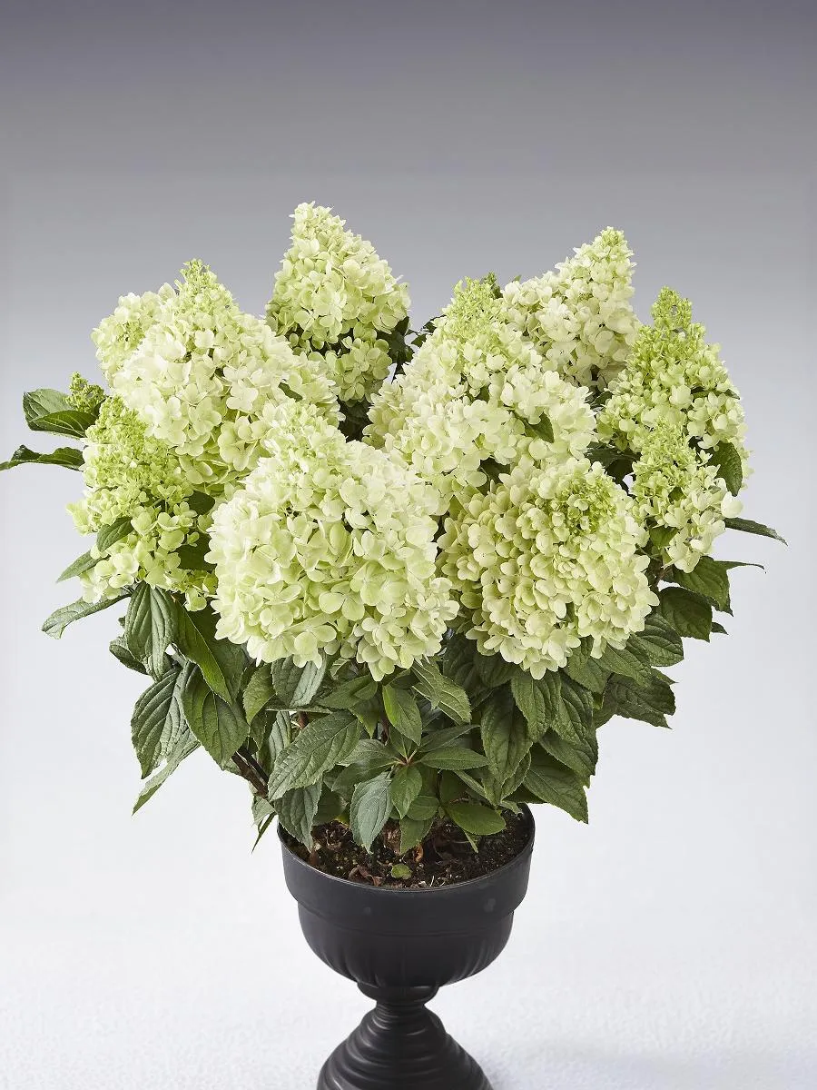 Гортензия метельчатая ‘Панорама’ - эксклюзивная серия патио немецкой селекции PAN – отличается невысокой, компактной формой куста, высотой до 100 см. Соцветия плотные, конусовидные, удивительной красоты и размера (до 40 см.), в начале цветения нежно-зелёного цвета, затем белые, к осени приобретают лаймовый оттенок, придавая саду атмосферу нежности и изысканности. Сорт практически не требуют формировки и обрезки, рано зацветает и обильно цветет с июня и до заморозков, неприхотлив в уходе. На солнечном участке или в легкой полутени цветение будет пышнее и ярче. Гортензии присущ нежный, ненавязчивый аромат.