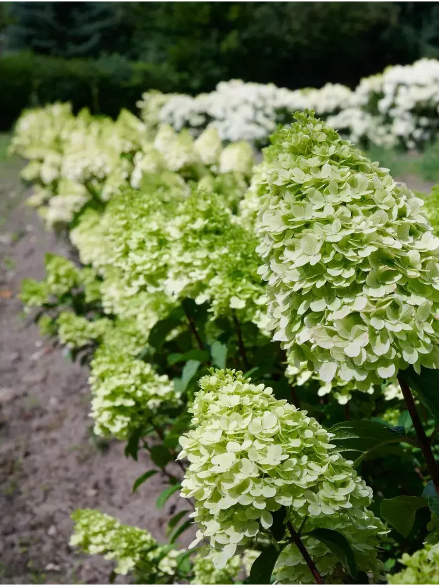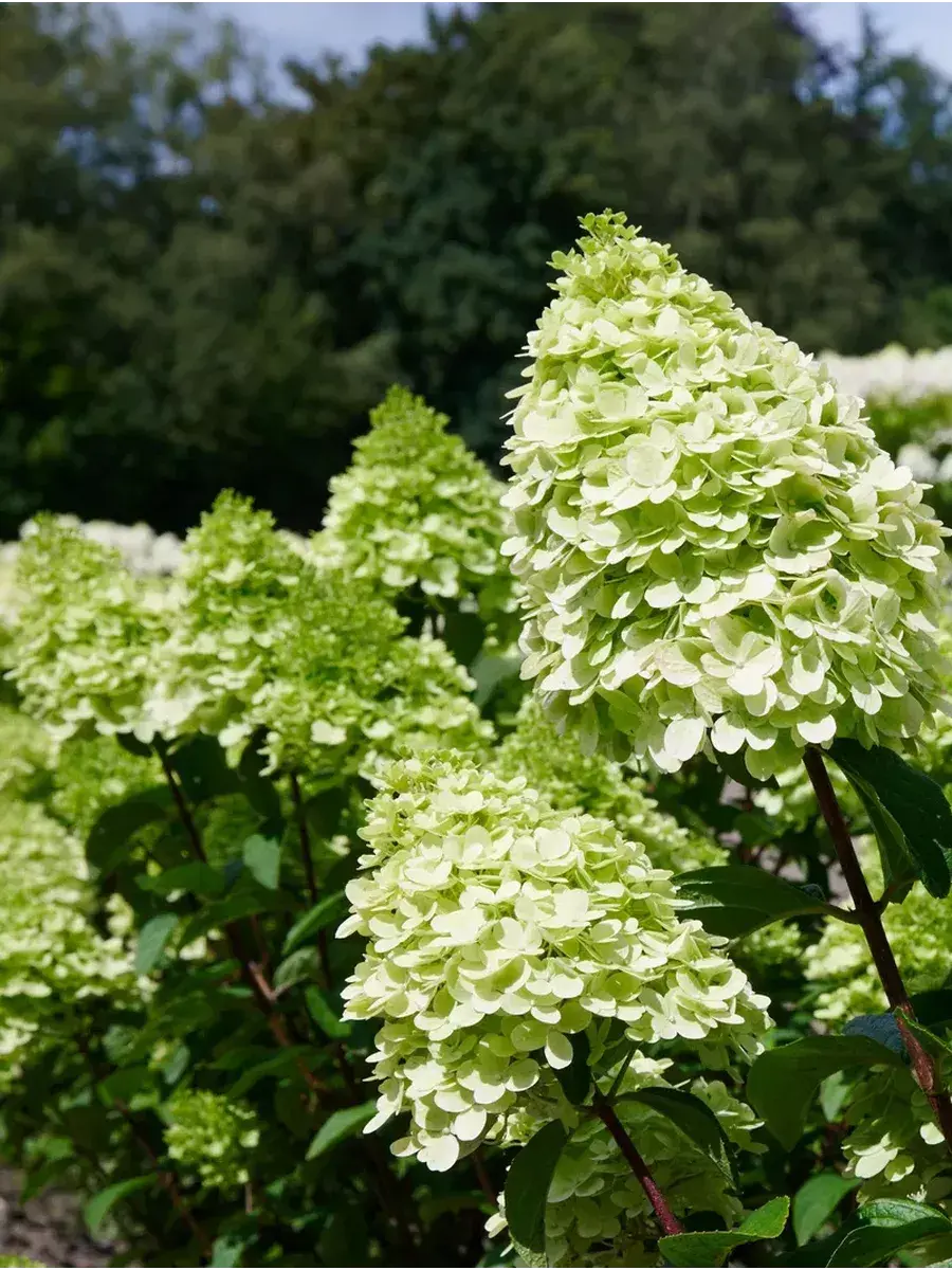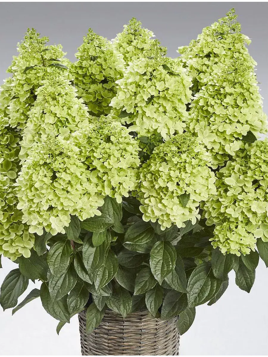 Саженец гортензии метельчатой, поставляется в контейнере P14, возник в Германии с 2022 года, постоянноцветущая с июля по октябрь, окраска цветков светло-зеленая, осенью становится пурпурным, размер соцветия 40 см, у взрослого растения высота от 80 до 100 см, а ширина до 70 см, у гортензии очень хорошая устойчивость к дождю (цветки дождём не портятся) и к морозам до -34°C (4 зона) зарубежное название - Hydrangea paniculata Pantheon
