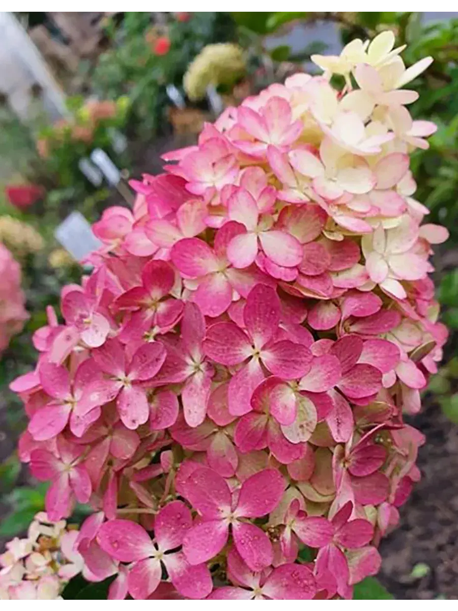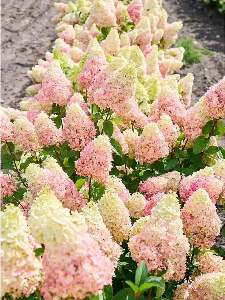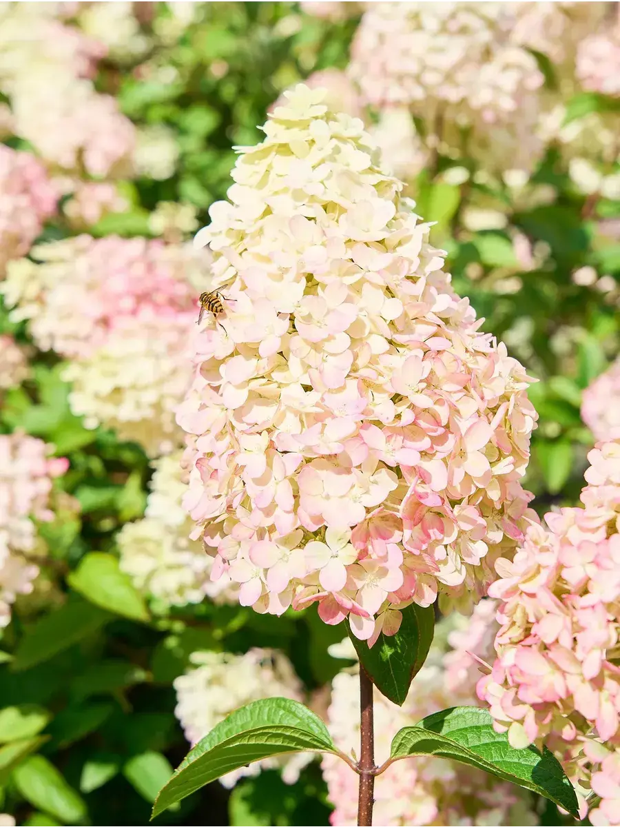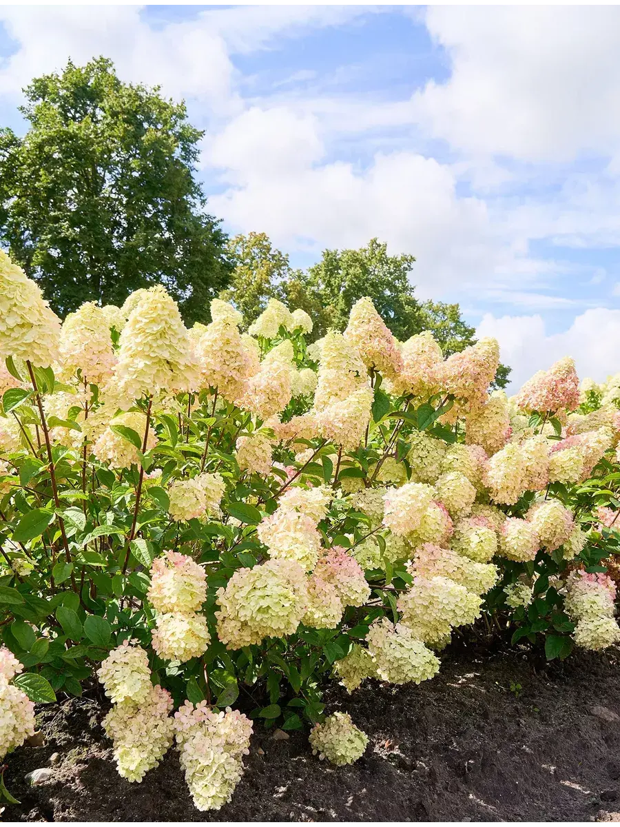 Саженец гортензии метельчатой, поставляется в контейнере P14, возник в Германии с 2022 года, постоянноцветущая с июля по октябрь, окраска цветков светло-зеленая, осенью становится пурпурным, размер соцветия 40 см, у взрослого растения высота от 80 до 100 см, а ширина до 70 см, у гортензии очень хорошая устойчивость к дождю (цветки дождём не портятся) и к морозам до -34°C (4 зона) зарубежное название - Hydrangea paniculata Pantheon