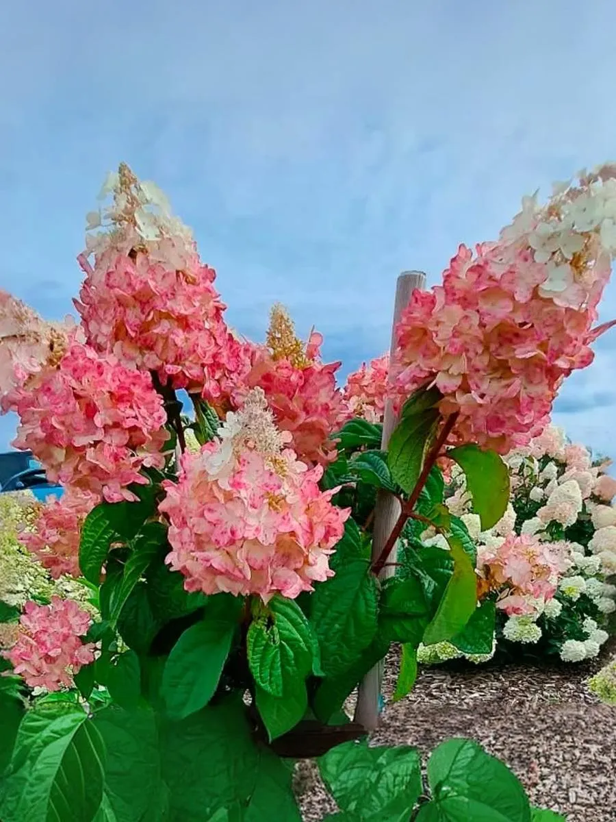 Гортензия метельчатая Петит Лантерн - карликовый кустарник, вырастающий до 80 см в высоту и 40 см в ширину, образуя очень большие метельчатые соцветия на верхушках побегов. Соцветия удлиненные. Во время цветения соцветия меняют цвет с белого на кремовый, а затем на цвет малины. Цветет декоративный кустарник с июля по октябрь. Простое в выращивании растение; устойчиво к морозам, но требует солнечных мест.