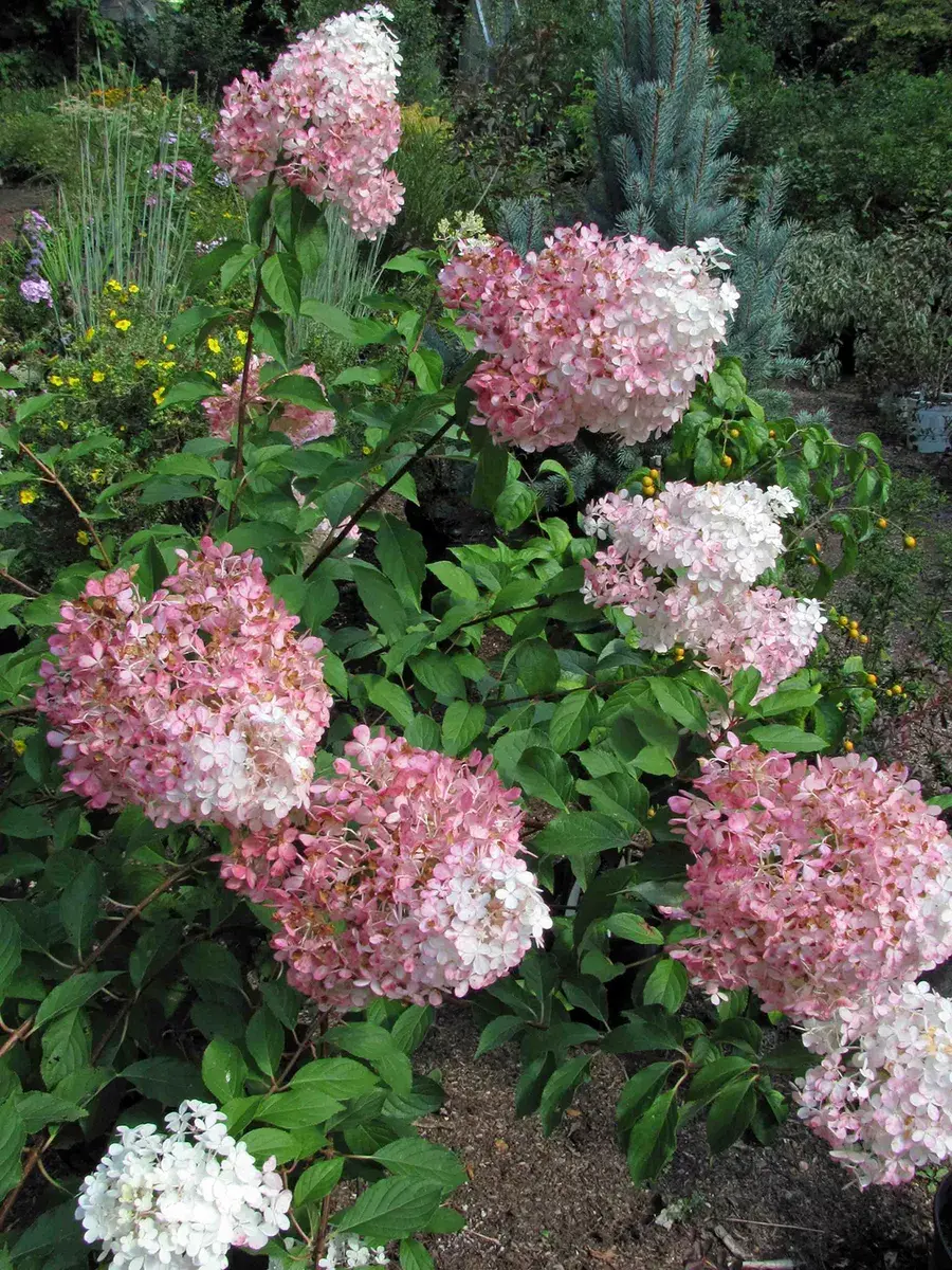 Саженец гортензии метельчатой, поставляется в контейнере P9, постоянноцветущая с июля по октябрь, окраска цветков изначально белая, но постепенно становится розовым, размер соцветия 15 см, у взрослого растения высота до 120 см, а ширина до 150 см, у гортензии очень хорошая устойчивость к дождю (цветки дождём не портятся) и к морозам до -34°C (4 зона) зарубежное название - Hydrangea paniculata Tickled Pink