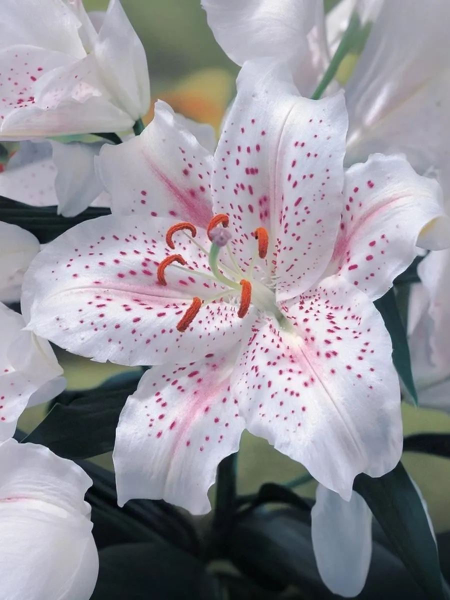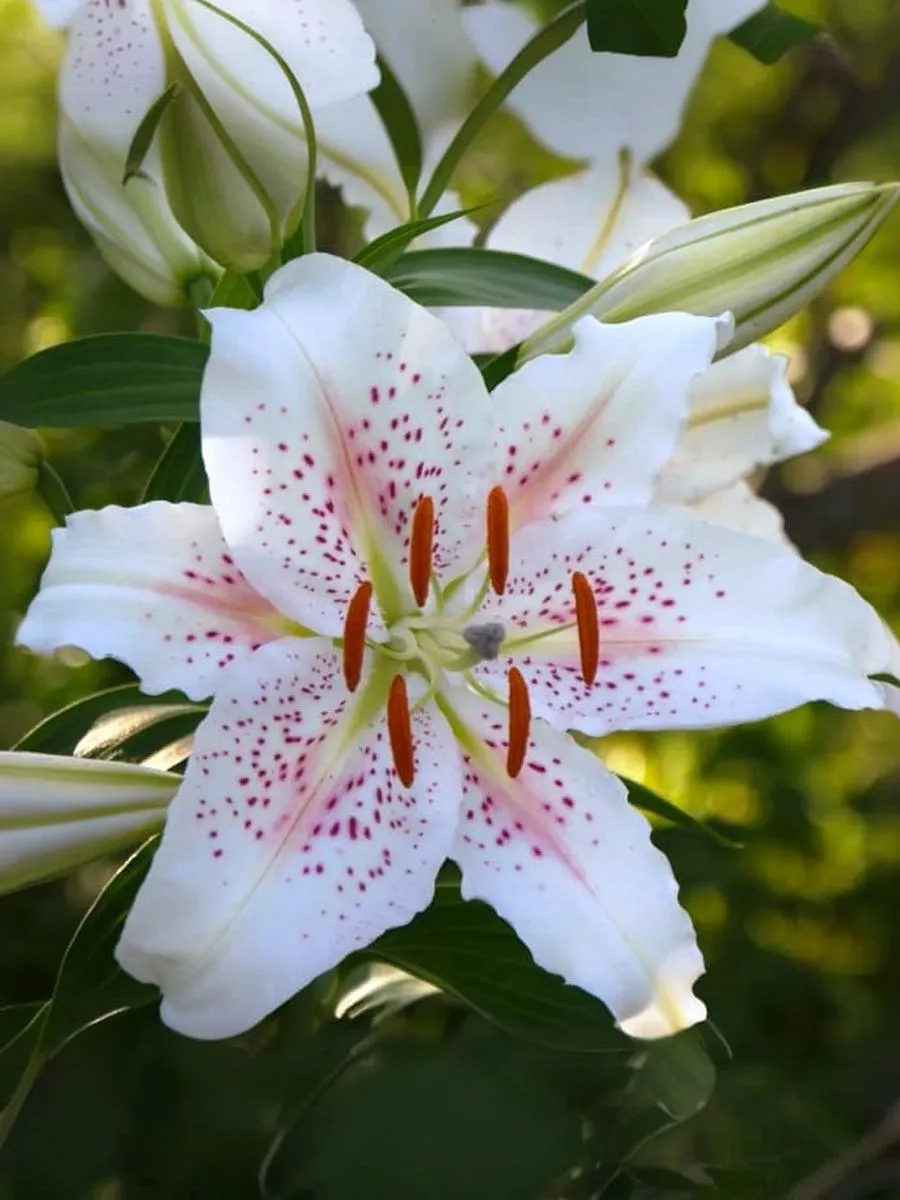 Цветки белые, у основания зеленоватые, с розовой полосой по средней линии, с бордовым крапом, по краям волнисто-гофрированные. На одном стебле может располагаться до 15 цветков в диаметре 18 и больше сантиметров. Высота 80 см. Подходит для выращивания в горшках. Стебли прочные, облиственные. Нежный стойкий аромат. Период цветения июль-август.