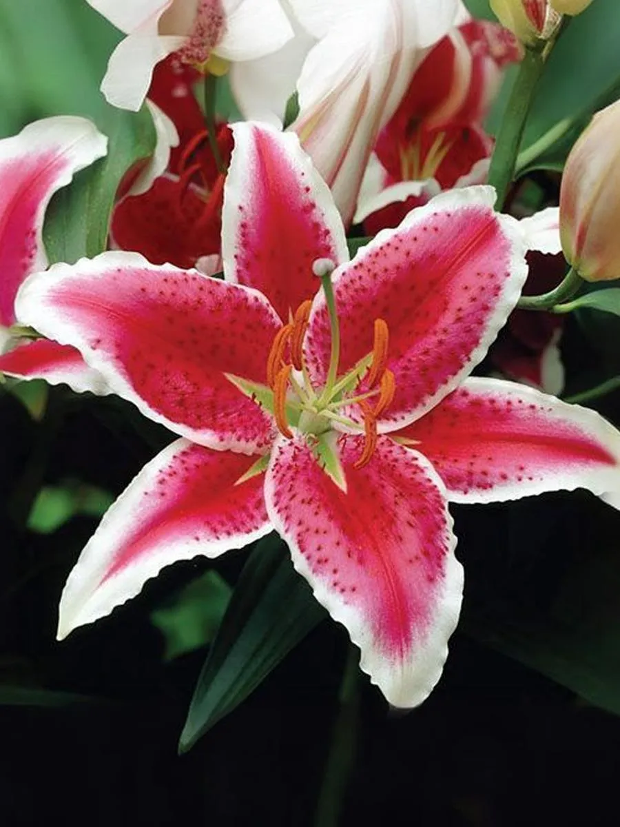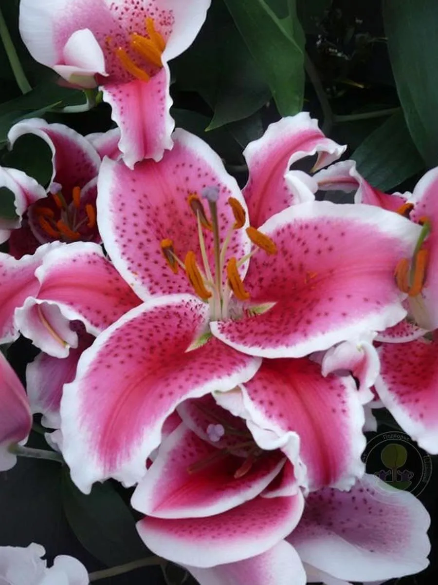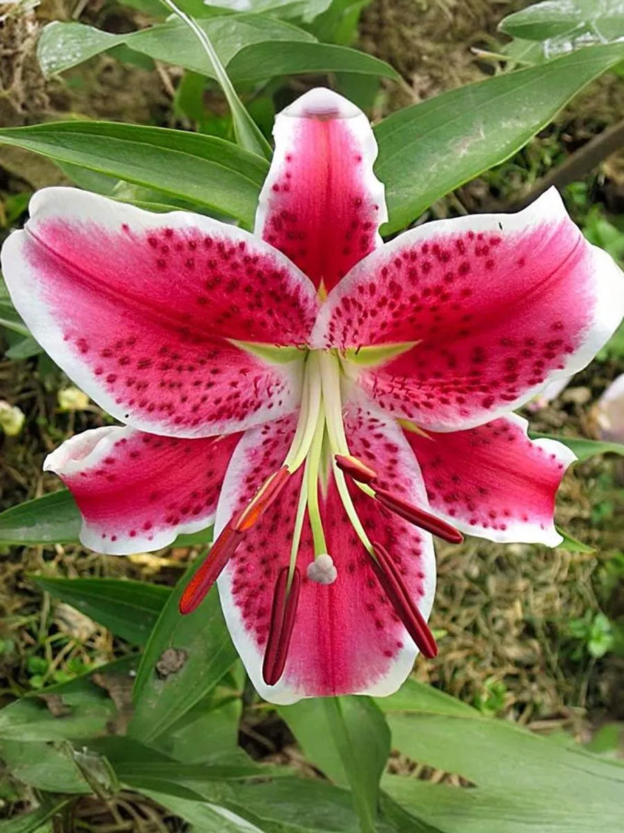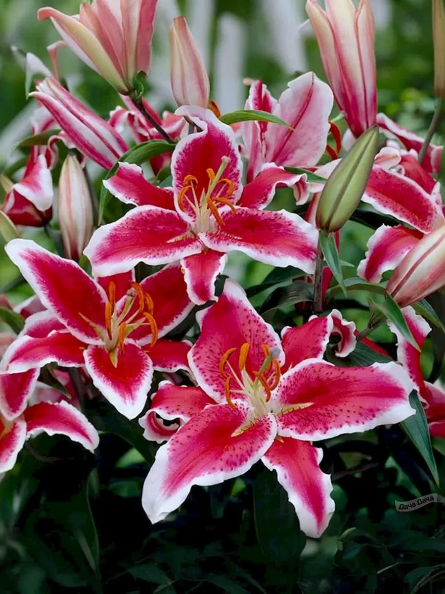 Цветок ярко-коралловый с белой каймой и бордовым крапом. Легкое гофре по краям лепестков. Высота 110 см. Стебли прочные, облиственные. Цветки данной лилии 20 см в диаметре. Насыщенный сильный аромат. Период цветения июль-август. Сорт неприхотливый, хорошо разрастается.