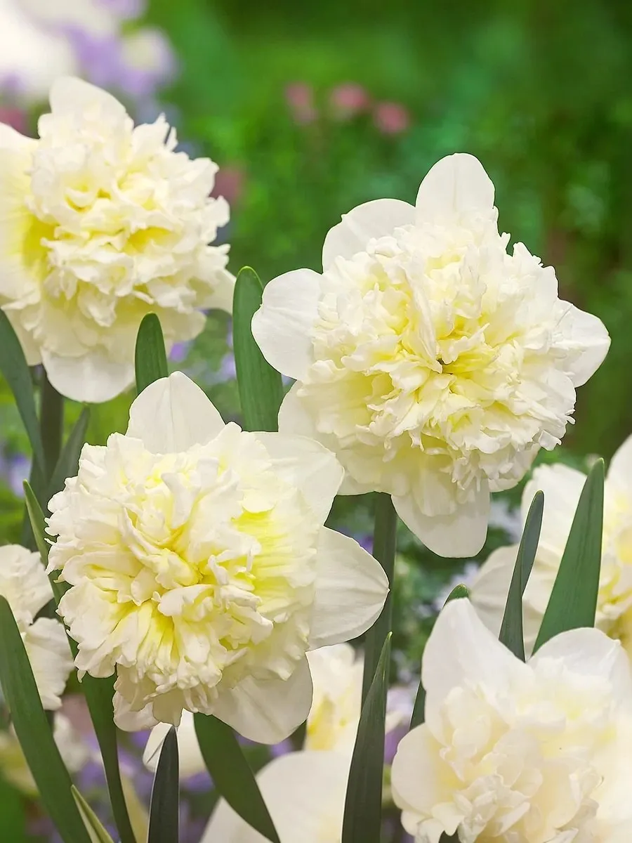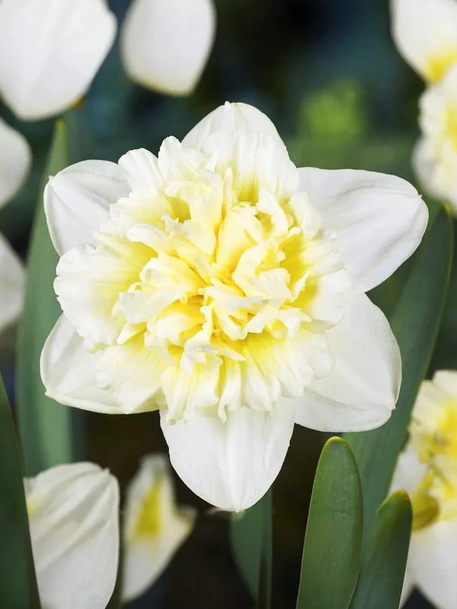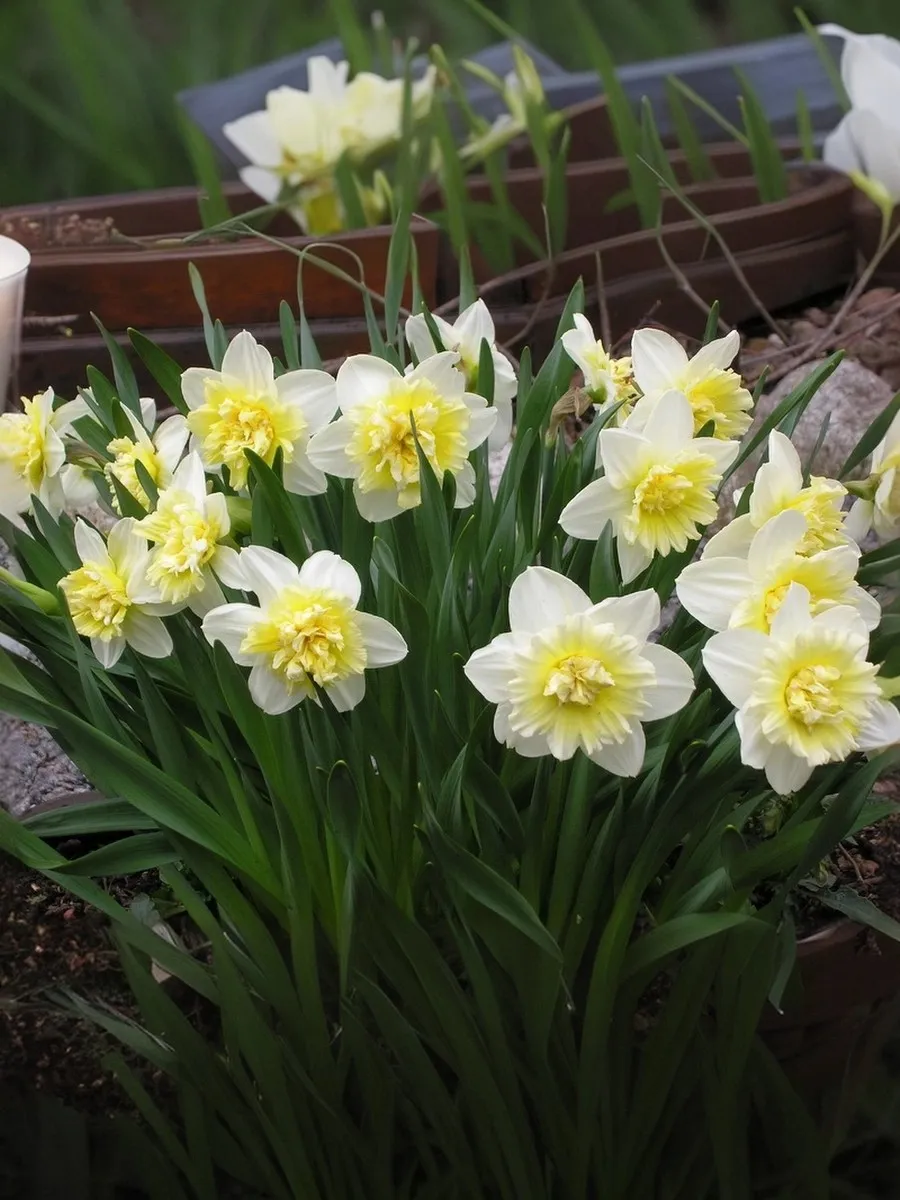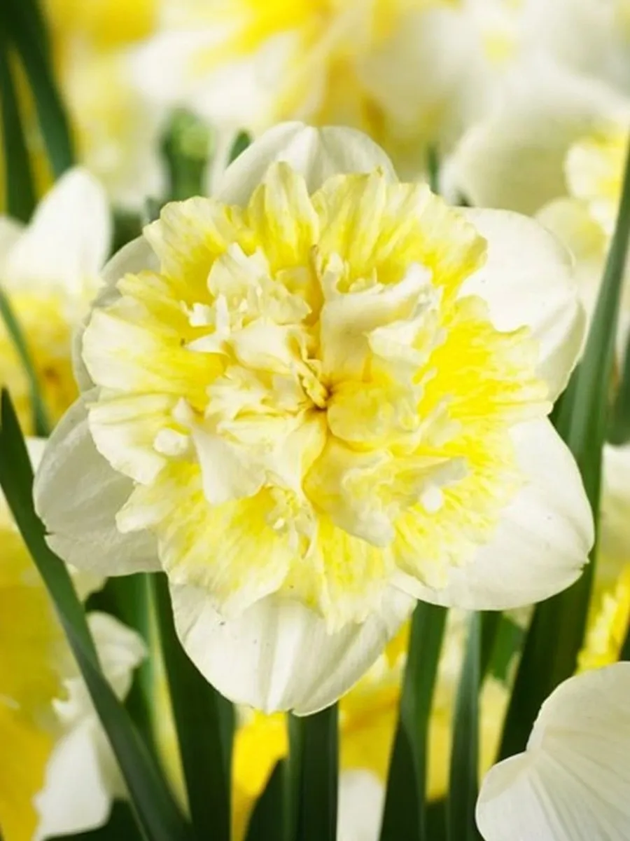 Цветы махровые, раннецветущие (март-май), очень крупные (13 см в диаметре!). Но главное достояние – это пышная гофрированная коронка с сильно изрезанными краями. Окраска нарцисса изменяется, от сливочно-белой и насыщенно-желтой вначале, до однотонно-кремовой под конец цветения. Количество цветов с каждым годом увеличивается, поэтому приготовьтесь к невероятной буре эмоций.