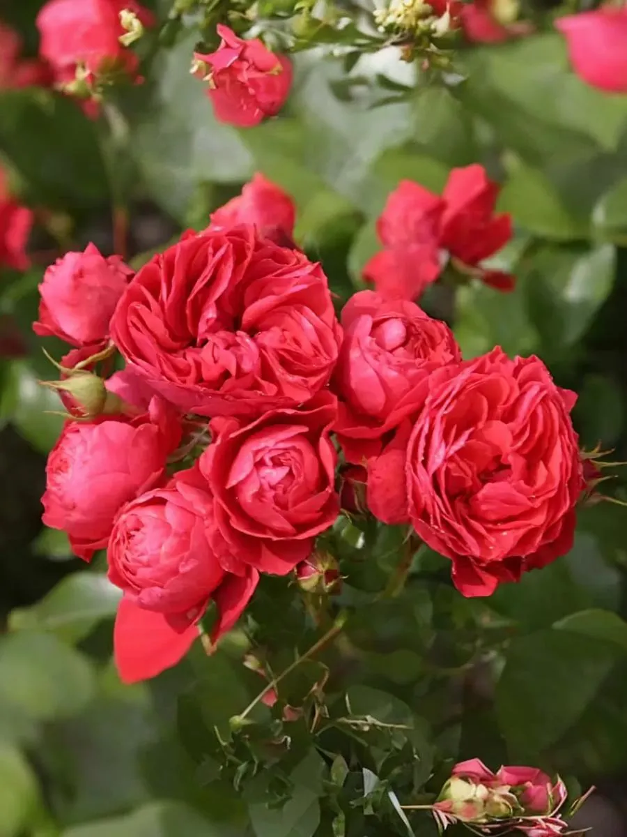 Данный сорт имеет вишнево-красные, густомахровые (до 60-70 лепестков), чашевидные цветки классической формы появляются в небольших кистях из темно-красных, округлых бутонов. Аромат легкий. Куст компактный, вертикальный, плотный, с темно-зеленой, сильно глянцевой листвой. Высота: 80-100 см