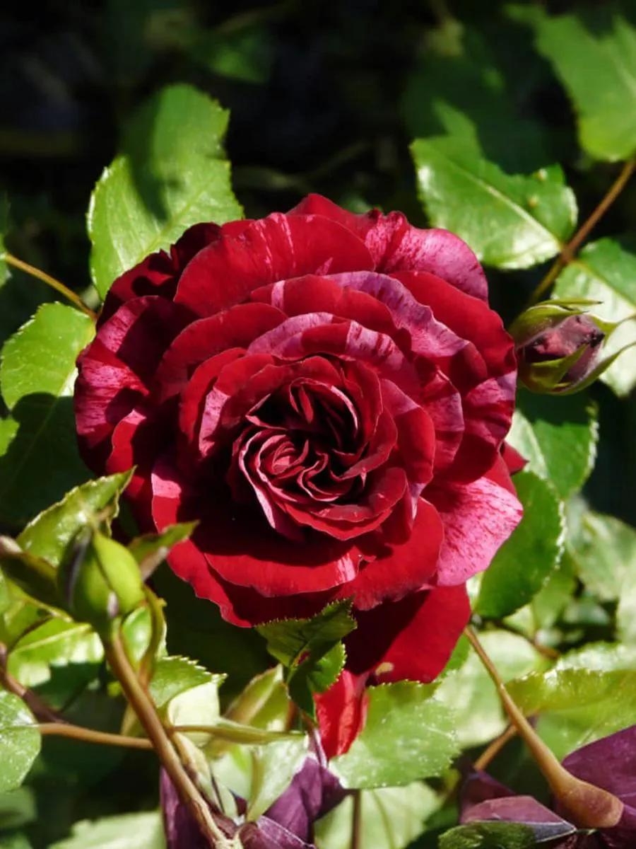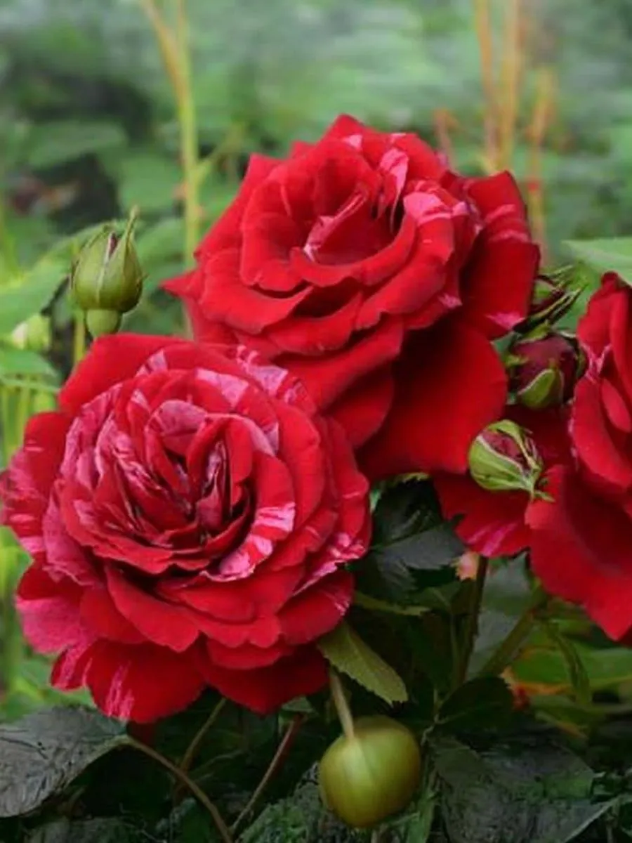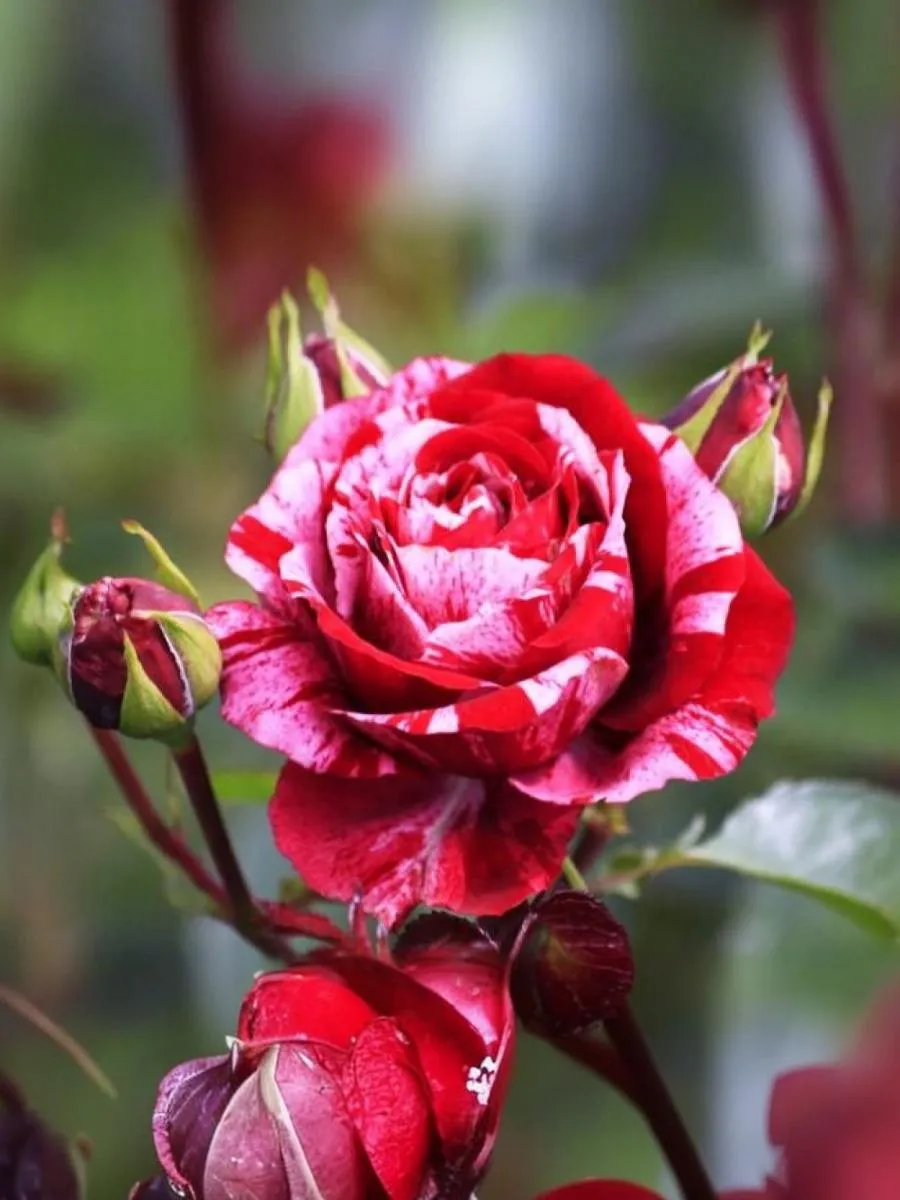 Замечательная роза, ценная благодаря своей уникальной окраске. Цветки темно-красные с розовыми штрихами и полосками. Куст густой, ветвистый, округлой формы. Активно нарастает начиная со второго года после посадки. Листва темно-зеленая, блестящая. Легкий аромат малины.