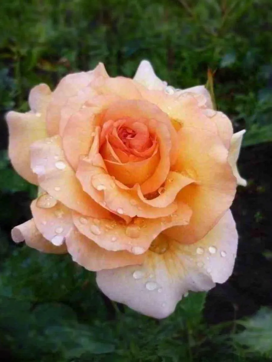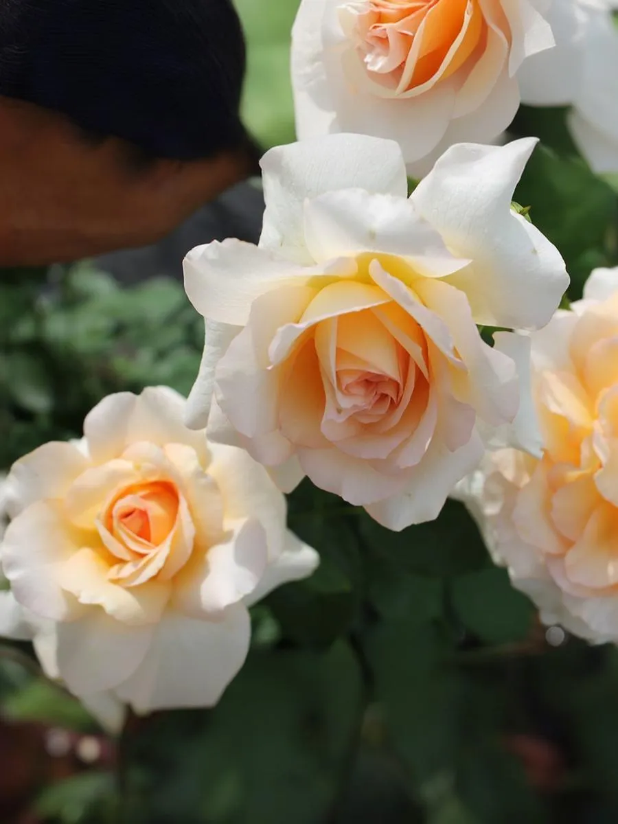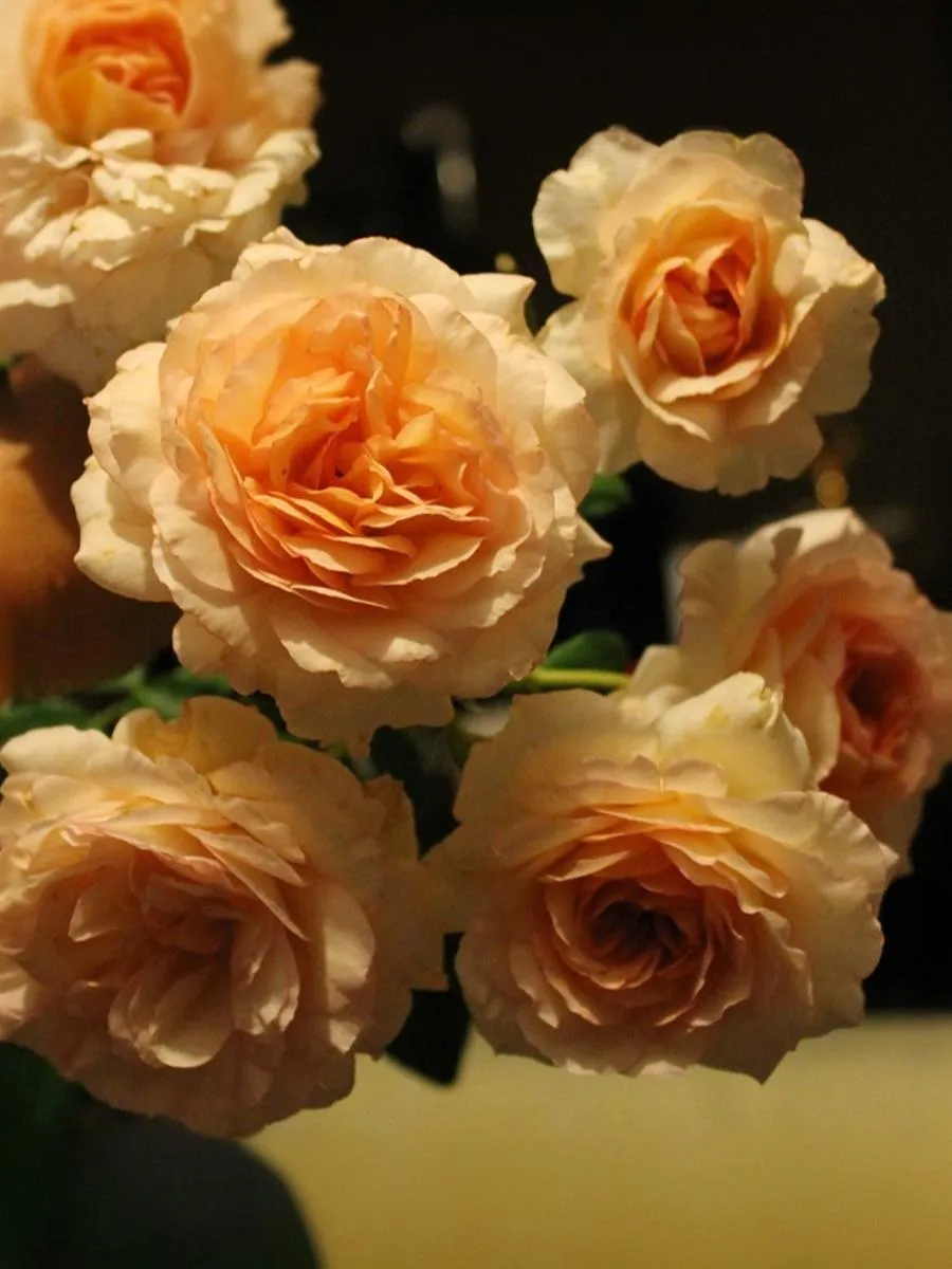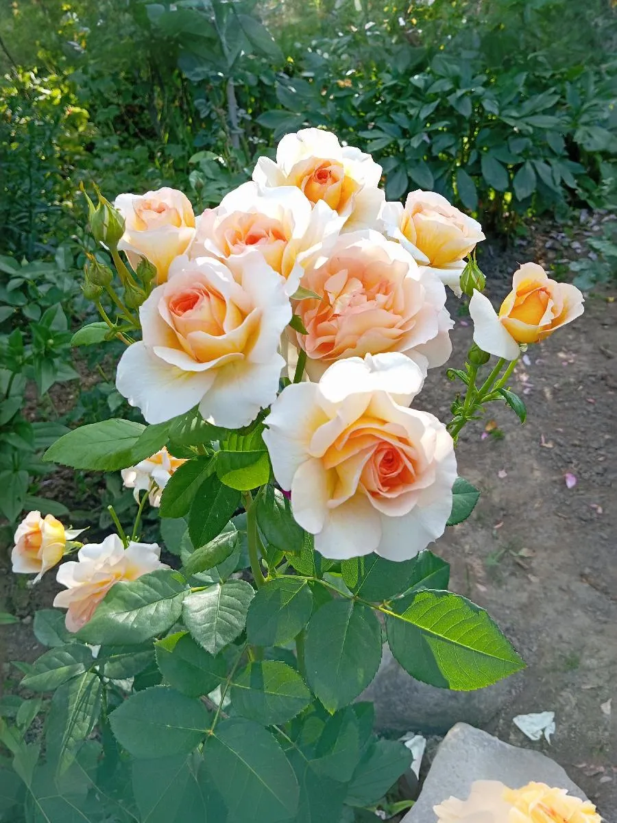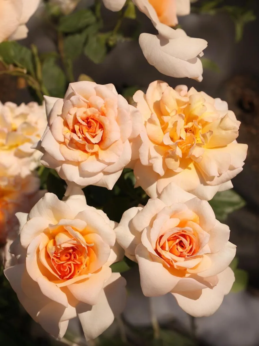 Соцветия данной розы светло-абрикосовые с лососево-желтым центром, чашевидные, махровые цветки из 55 - 60 лепестков, с легким ароматом появляются в соцветиях до 5-6 штук из темно-оранжевых, бокаловидных бутонов.