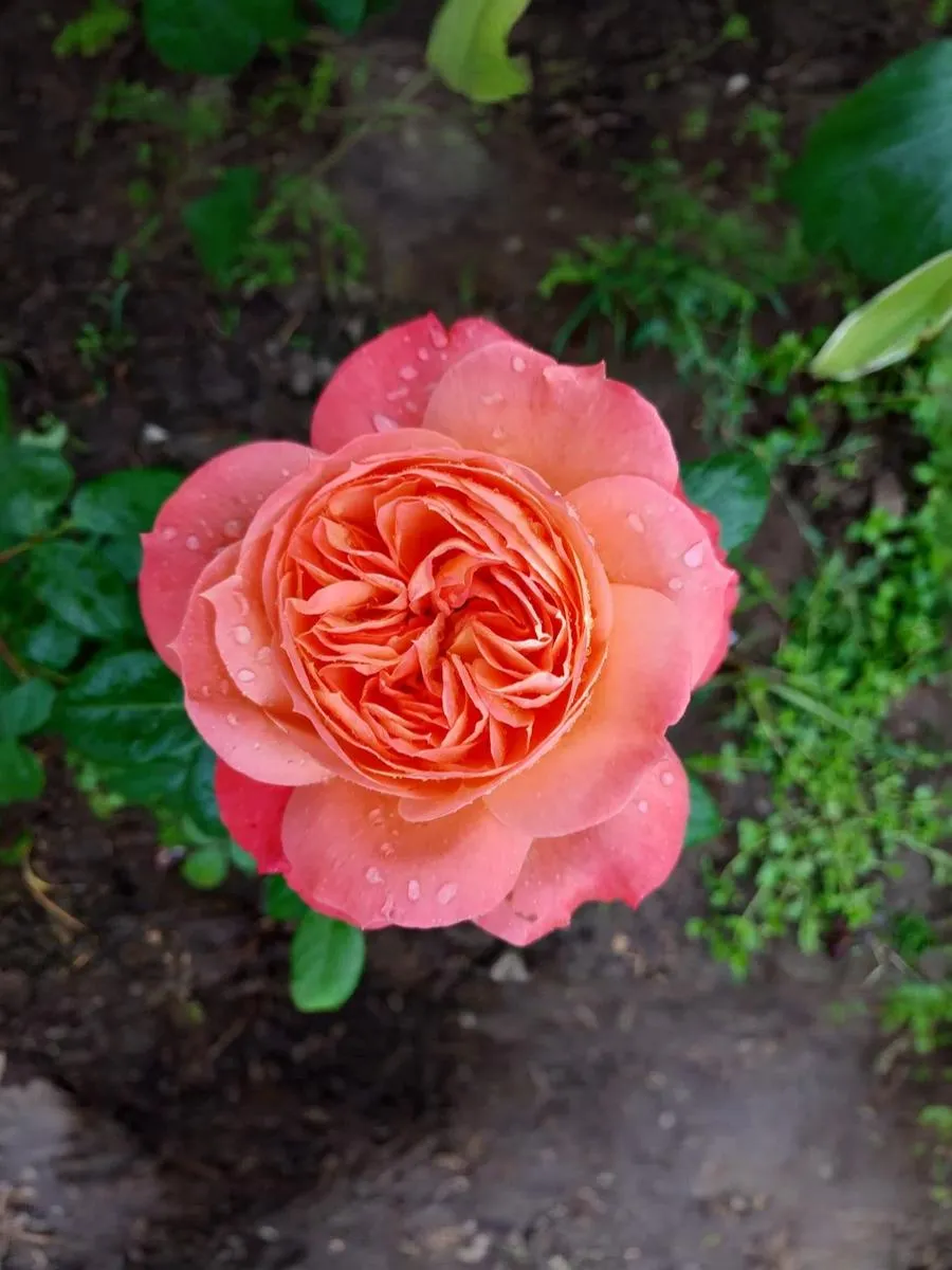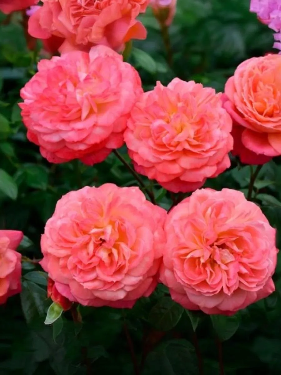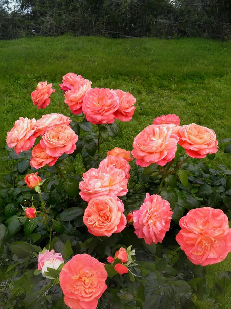 Лососево-оранжевые, блюдцевидные, густо-махровые (до 120 лепестков) цветки с легким ароматом, на побегах как одиночные, так и в небольших соцветиях. Куст вертикальный, компактный, с темно-зеленой, полу-глянцевой, плотной листвой. Цветение обильное, повторное.