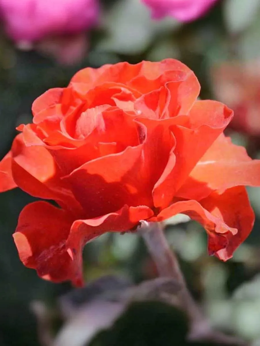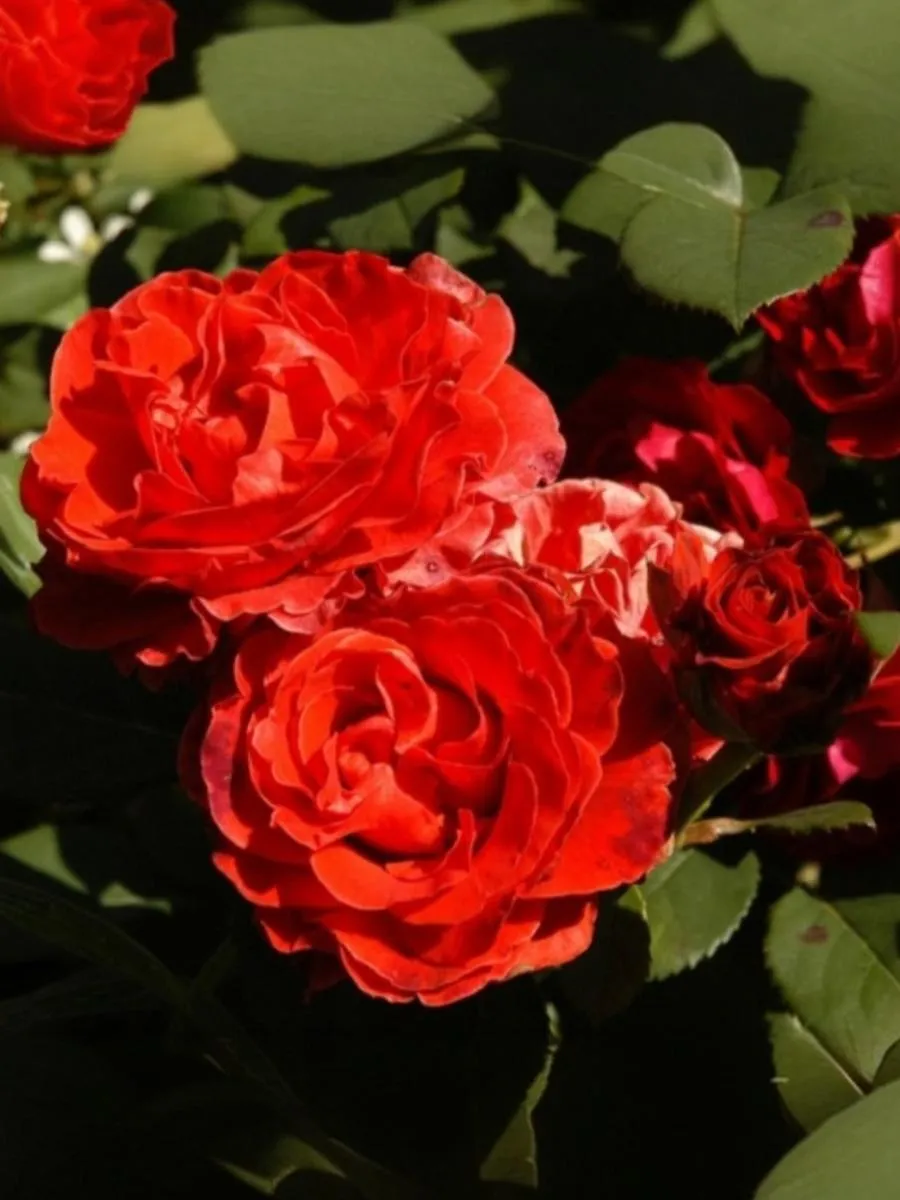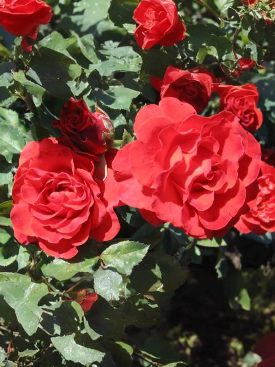 Цветки данного сорта очень яркие, карминово-красные, махровые крупные, лепестки гофрированные. Собраны в соцветия по 5-10 шт. Стебли прочные, вертикальные, листья плотные, темно-зеленые, цветки, стойкие к воде.