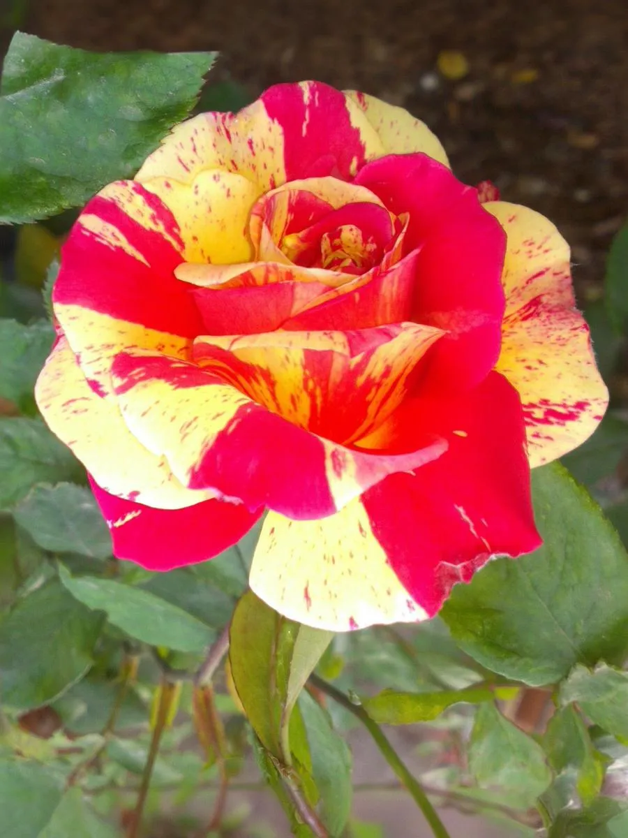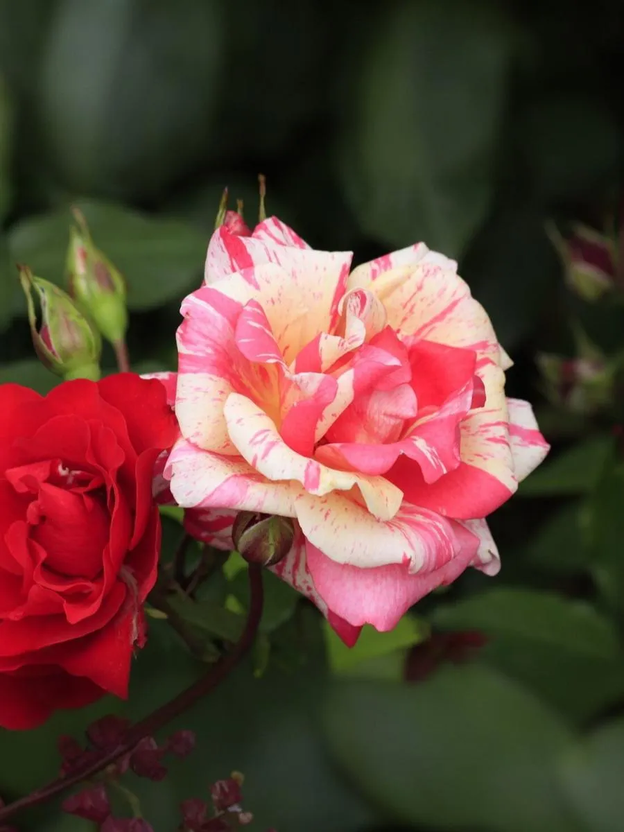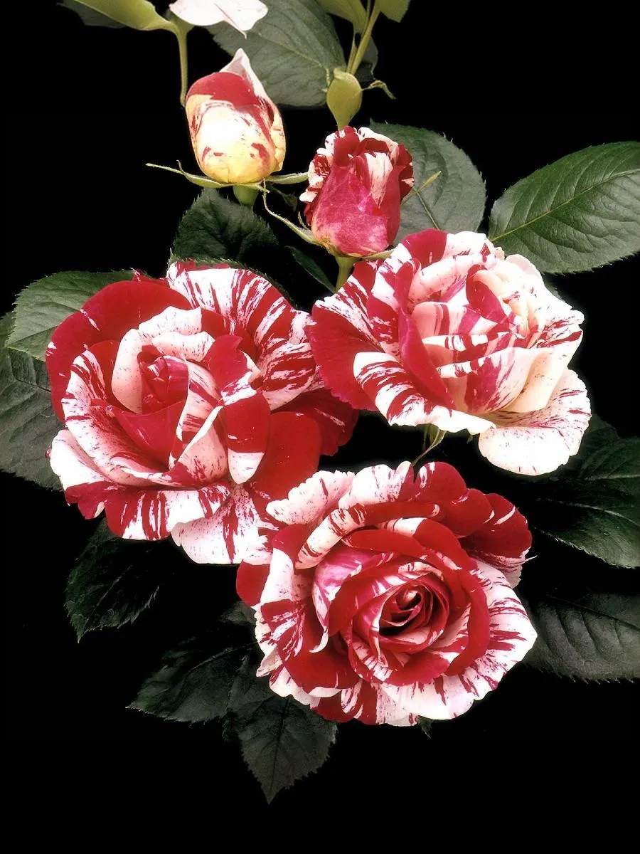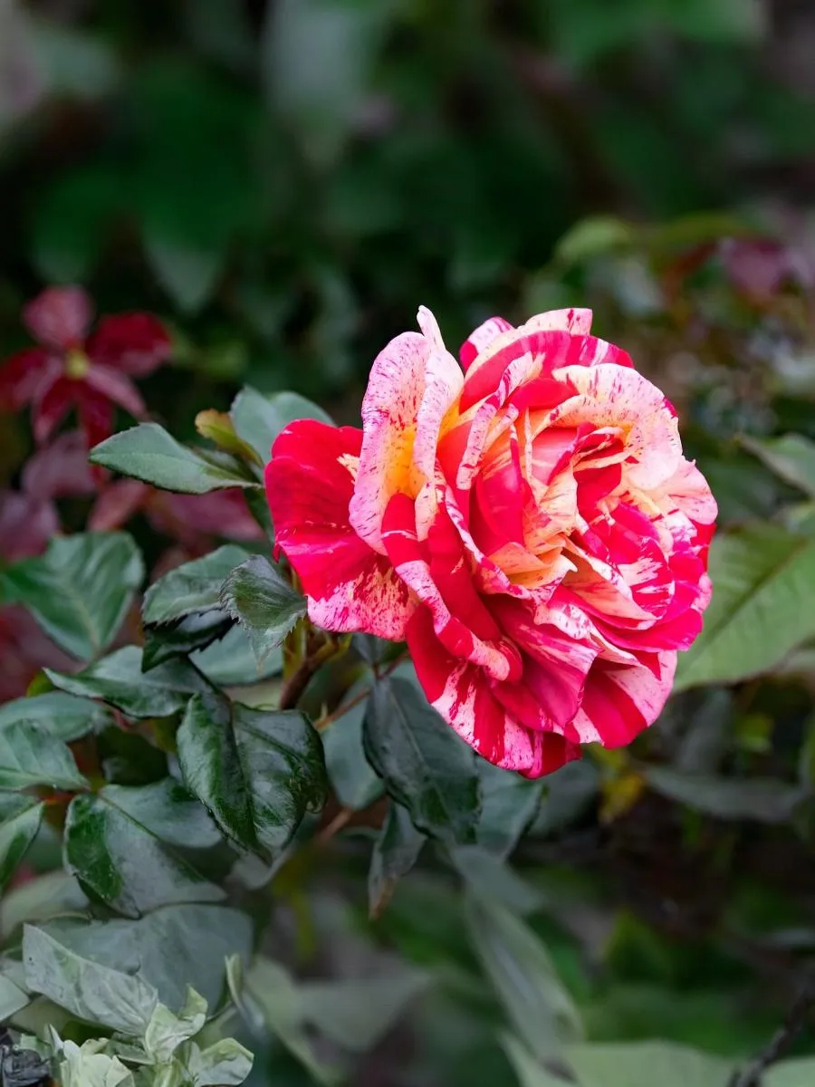 Роза Токаде-отличная пестроцветная роза группы флорибунда, заметно выделяется на фоне других роз своей неоднозначной окраской. Её нежно-жёлтые лепестки украшены клубнично-красными полосками. Цветки большие, махровые (17-25 лепестков), бокаловидные, в небольших кистях. Цветет в течение всего сезона.