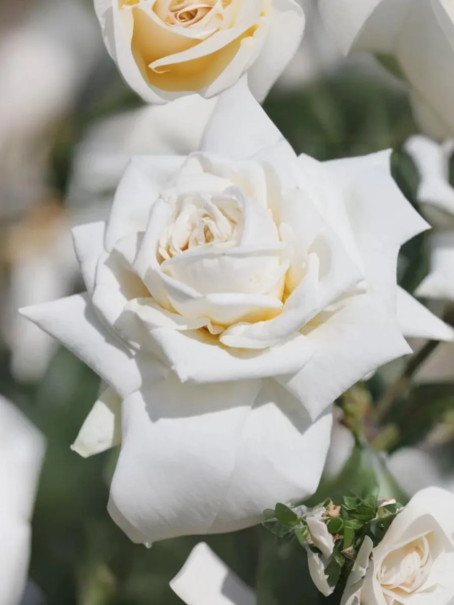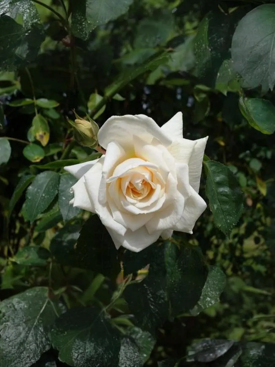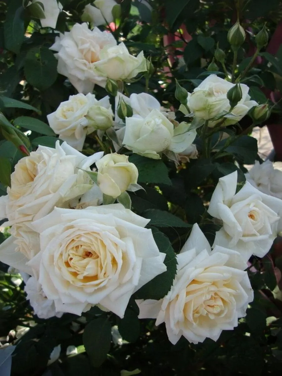 Крупноцветковый клаймбер белого цвета. Бутоны удлиненные, элегантные, кремово-белые, с крупными лепестками, которые начинают закручиваться по мере распускания цветка, совсем как у крупной чайногибрдной розы. Распустившиеся цветки густомахровые, Лепестки толстые, восковидные, светящиеся. В центре с легким оттенком сливочно-желтого цвета. Цветки появляются поодиночке или в небольших кистях до 3 шт, слегка поникают. Они хорошо переносят дождь и прекрасно сочетаются с темной блестящей листвой. Сорт устойчив к заболеваниям, побеги изящно поникают.
