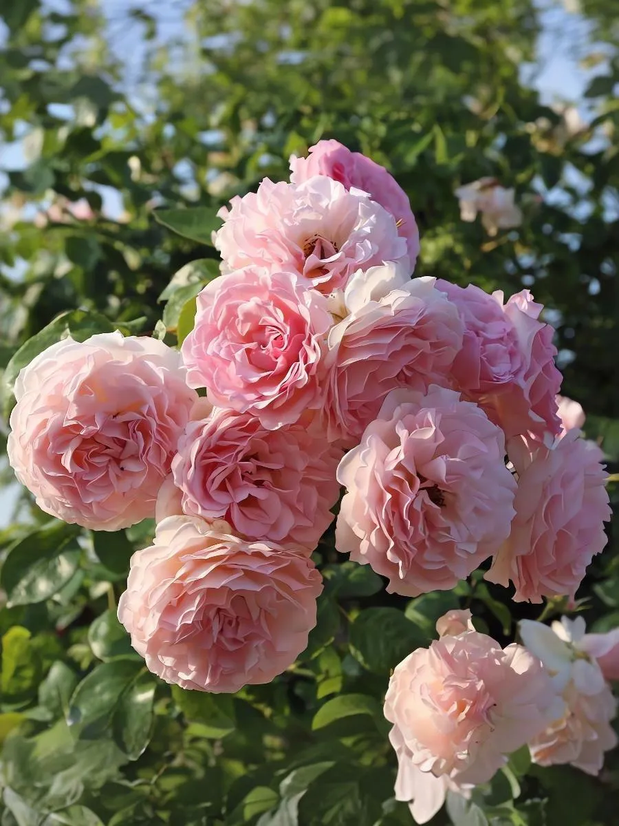 У этой розы крупные пастельно-розовые с абрикосовым оттенком, густомахровые цветы. Появляются по одному или в кистях. Побеги жёсткие, сильные, прямостоячие, с ярко-зеленой, блестящей листвой.