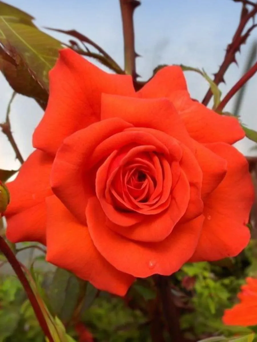 Роза отличается яркими крупными махровыми цветками. Они алого цвета, сочетающего в себе красный и оранжевый цвета. Цветки элегантные, махровые, по форме похожи на чайно-гибридные розы, появляются по одному или в небольших пышных кистях. Они красиво оттеняются темной блестящей листвой. Молодой прирост насыщенно-пурпурный. Куст цветет практически непрерывно.