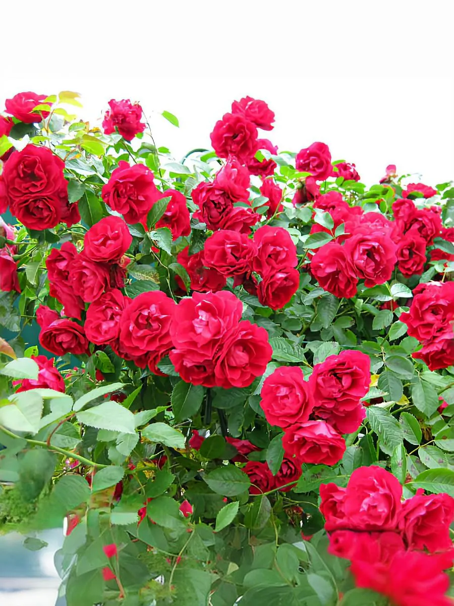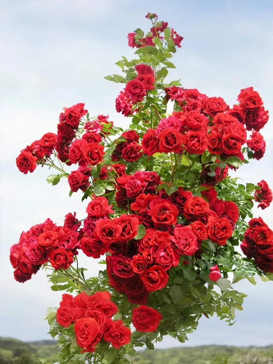 Этот сорт ярко-красный, с темно-малиновым отливом, что придает цветку роскошный бархатистый блеск. Цветки имеют форму чайно-гибридных роз, махровые, в небольших кистях, цветение очень обильное. Цветки хорошо выдерживают ветер и дождь. Куст ветвистый, сильнорослый, с блестящей ярко-зеленой листвой. Высота: 250-300 см. Размер цветка: 8-9 см.