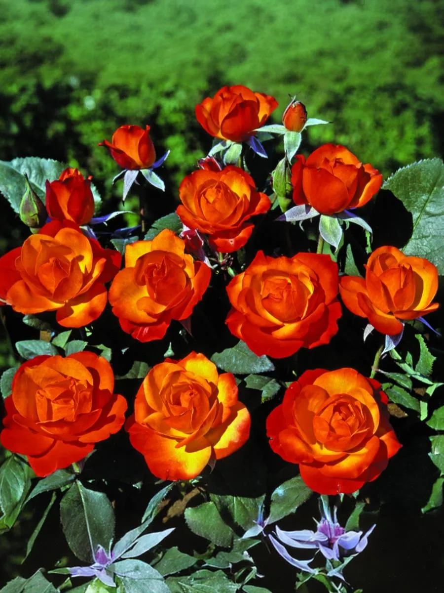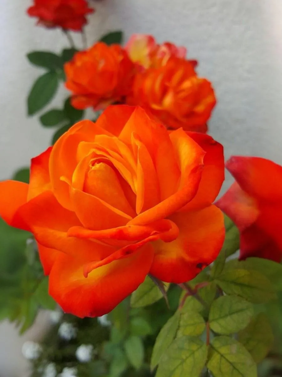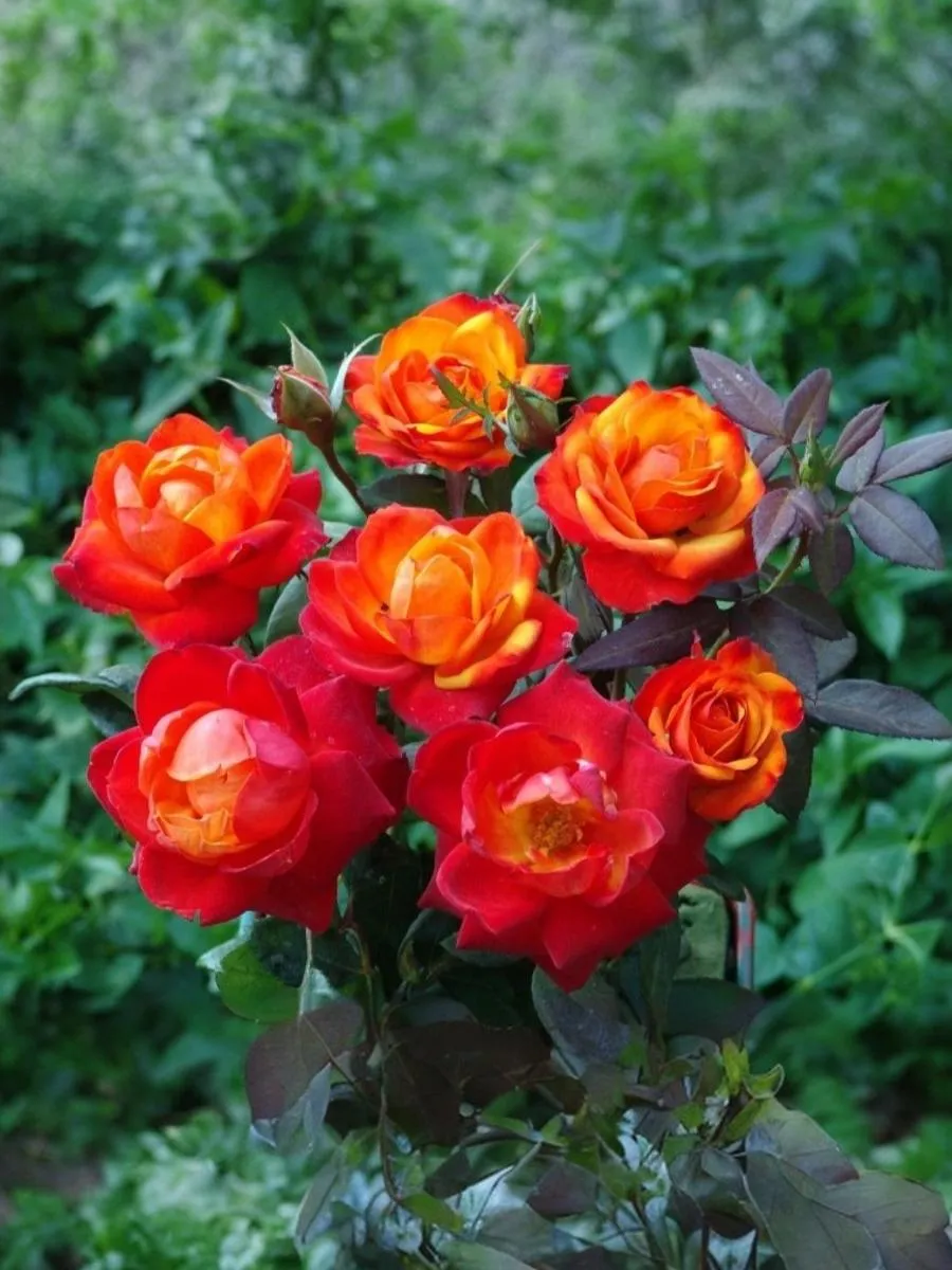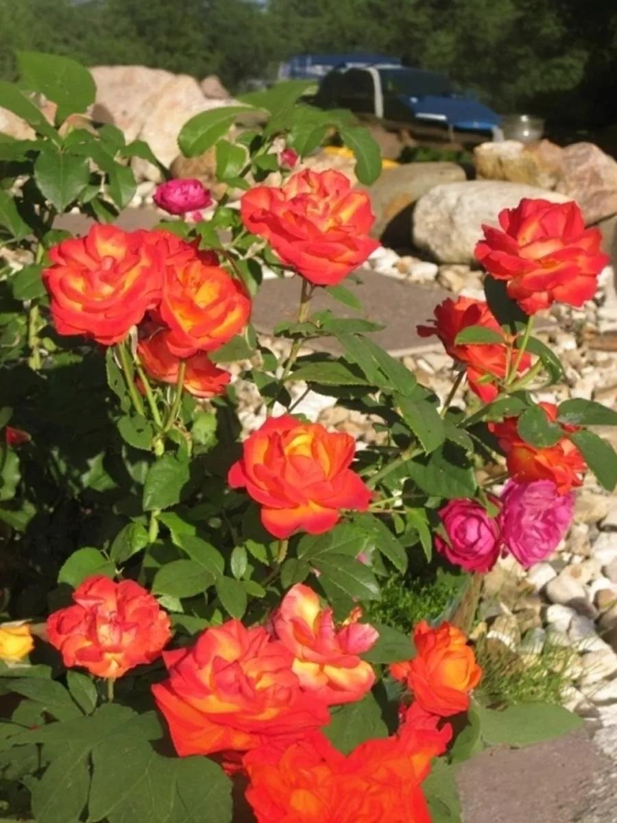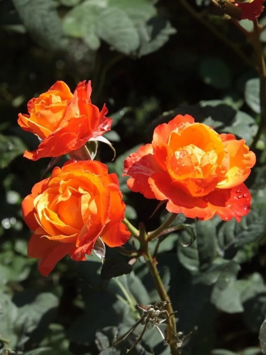 Этот плетистый сорт с очень яркими и красивыми цветками – золотисто-красно-оранжевыми с большим или меньшим преобладанием того или иного тона не только во время роспуска, но и в зависимости от погоды. Цветки махровые (17-25 лепестков), чашевидные. Цветение повторное, обильными волнами. Листва тёмно-зелёная, плотная, с высокой устойчивостью к болезням.