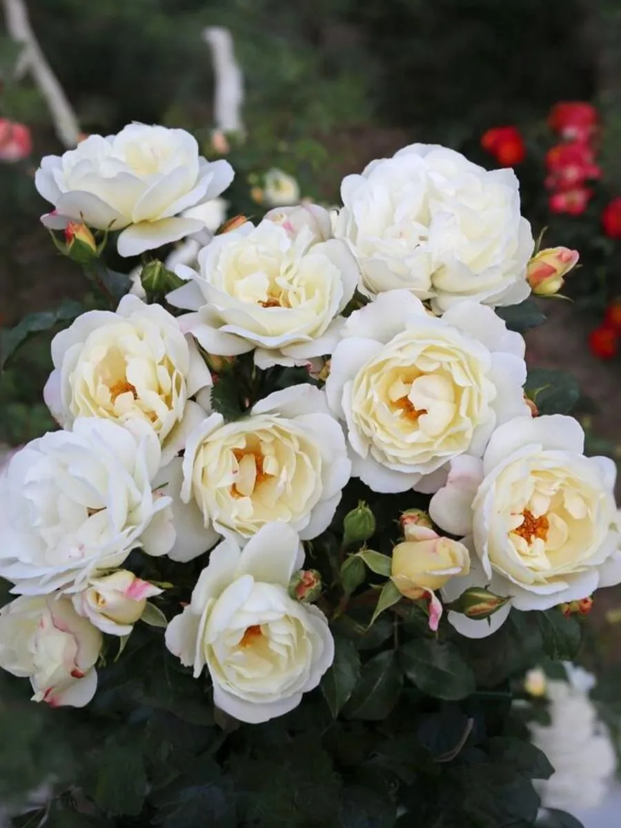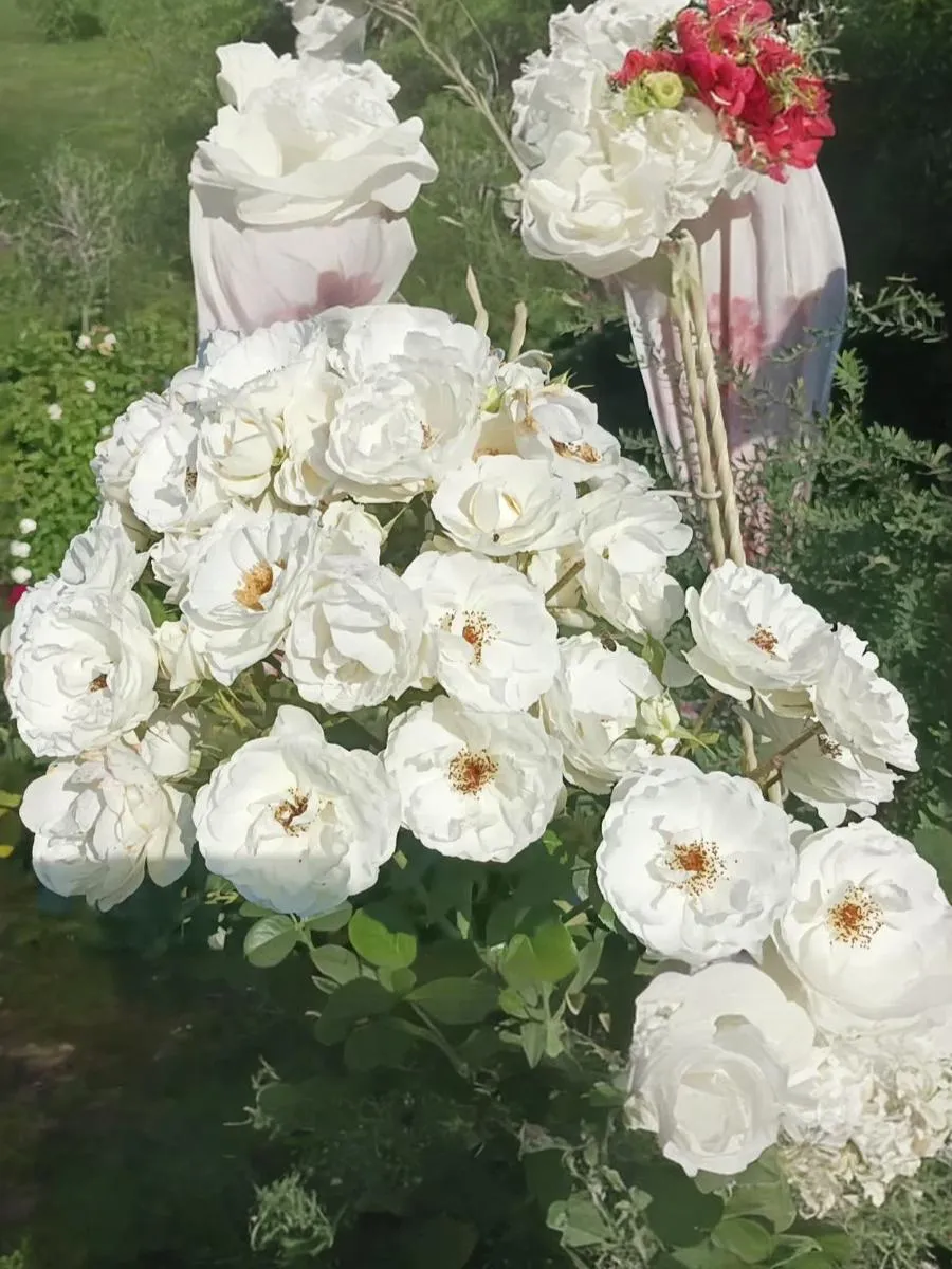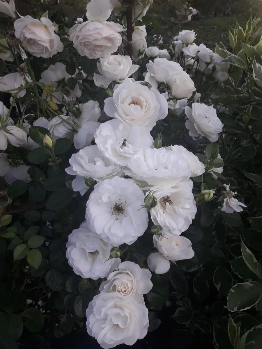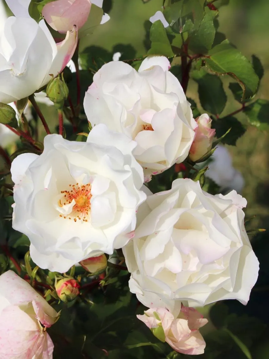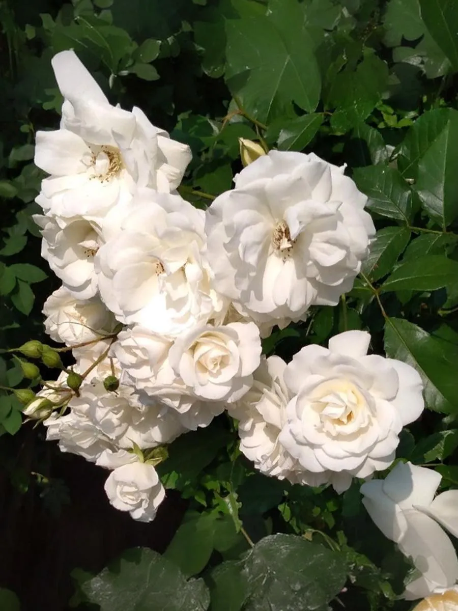 У этого сорта цветки полумахровые, чисто-белые, с пучком золотистых тычинок, появляются в кистях по 3-10 шт. Размер цветка: 7-8 см. Роза очень обильно цветет до заморозков. Охапки белоснежных крупных цветков с сильным сладковатым ароматом венчают многочисленные побеги высотой до 1,5 м. Листва темная, блестящая, крупная. Устойчив к болезням. Роза так энергично и широко разрастается, что быстро формирует плотные изгороди.