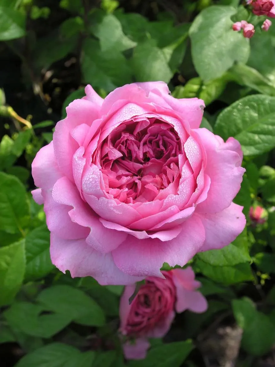 Этот ветвистый куст обычно достигает средних размеров, покрыт блестящей листвой. Цветки, напротив, очень аккуратные, появляются по 1-3 шт, чашевидные, квартированные, карминово-розовые. Аромат у розы - малины, клубники, аниса.