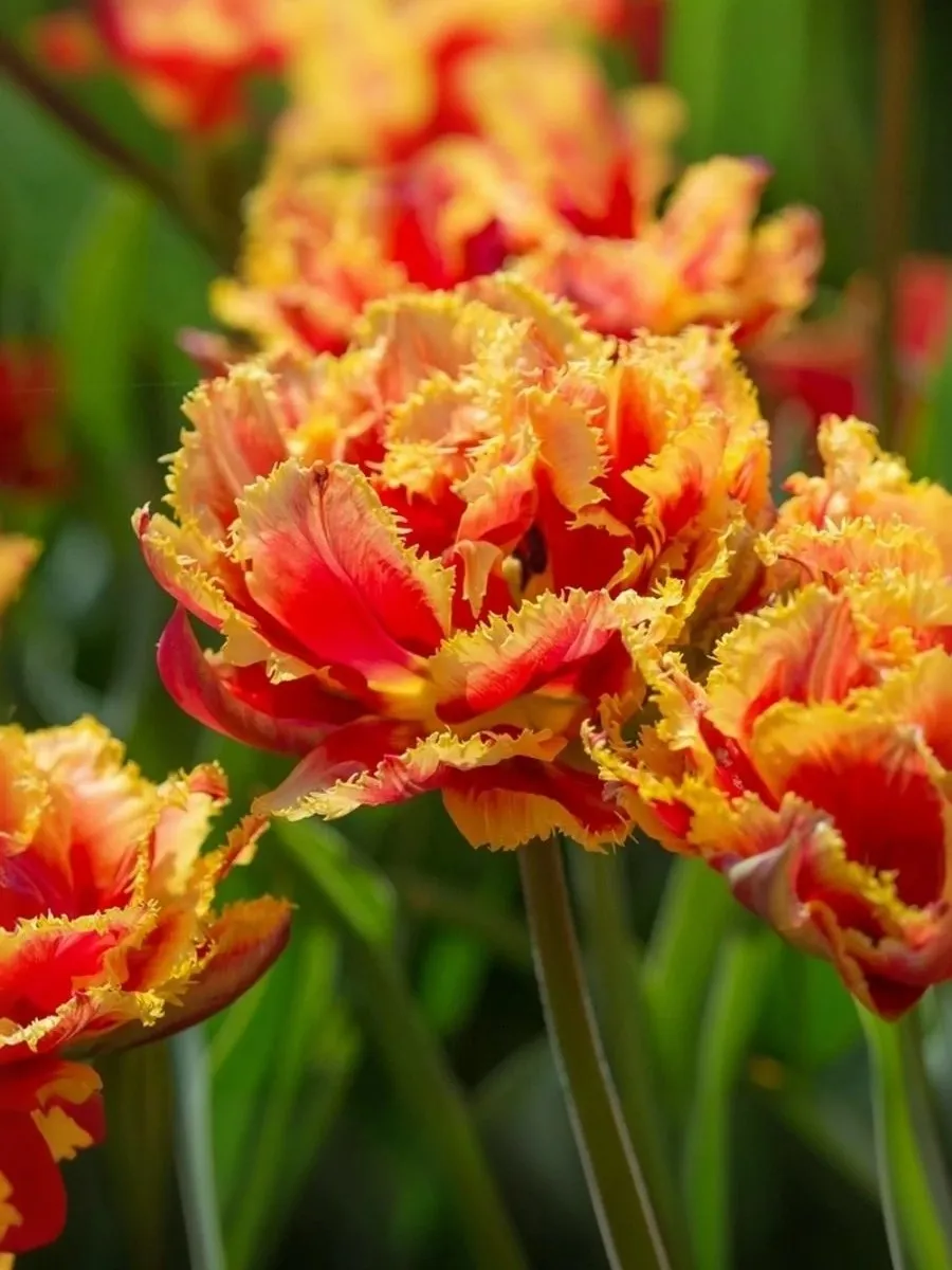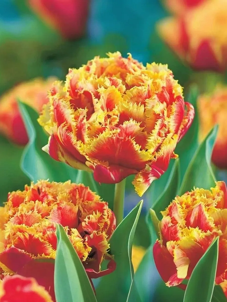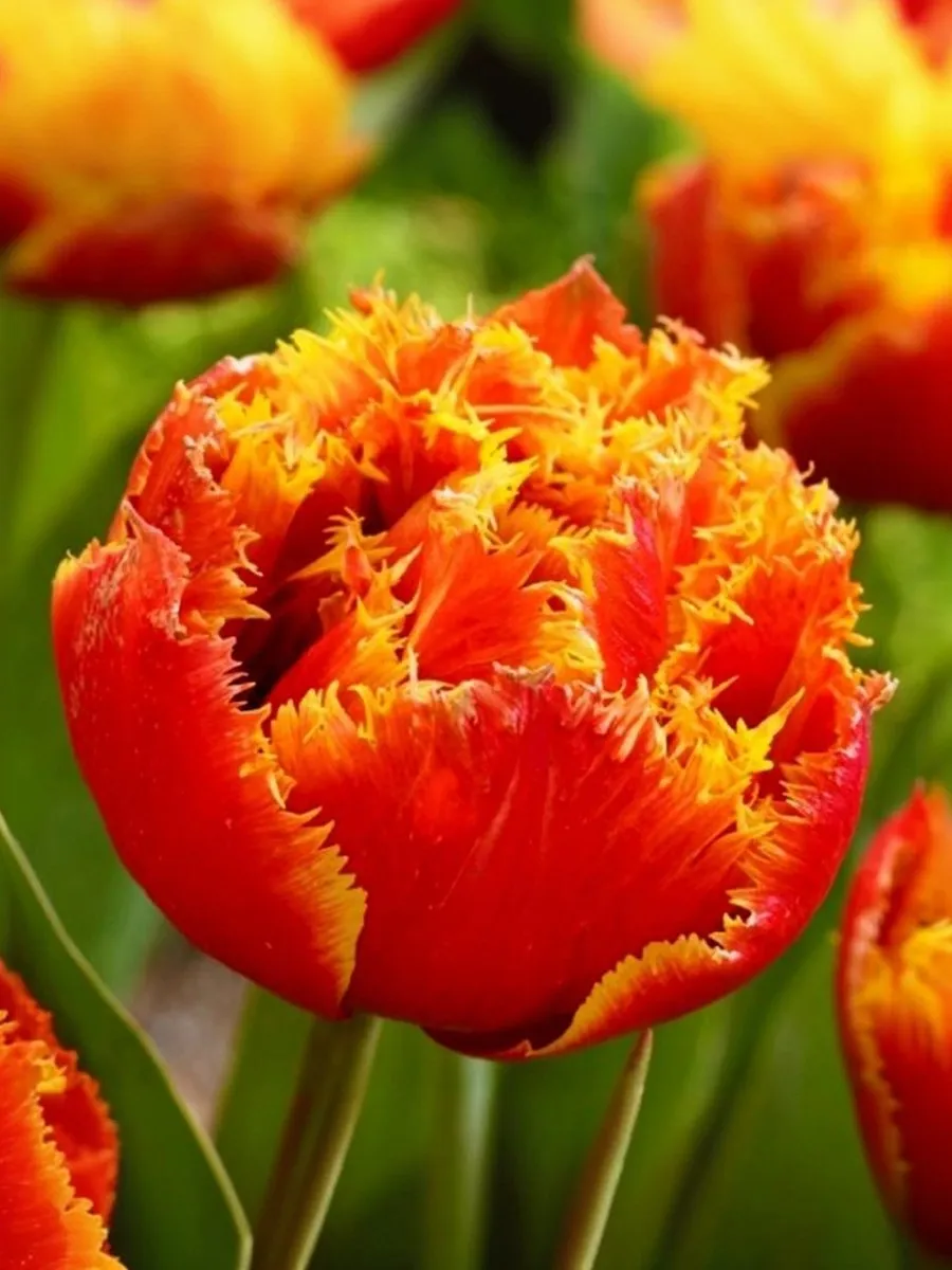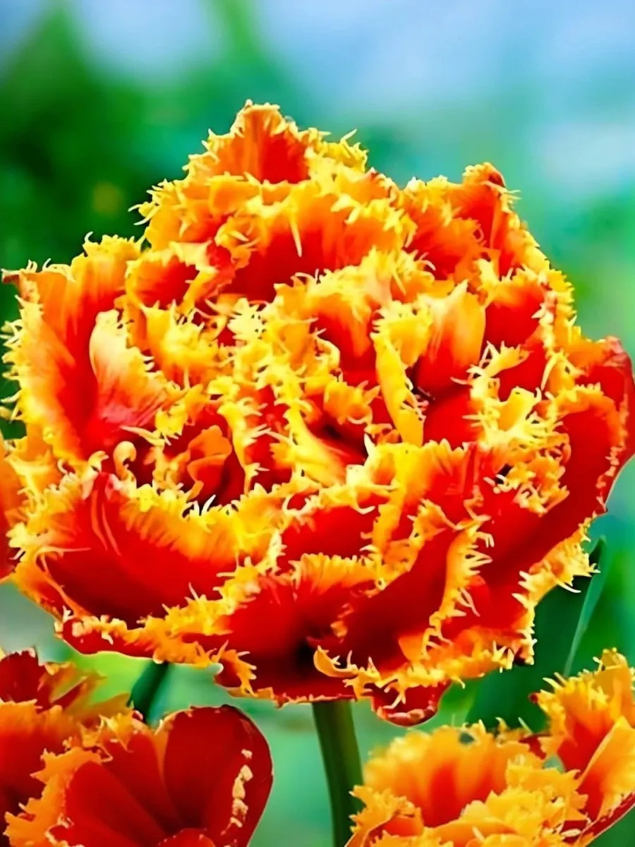 Густомахровый красный тюльпан с яркой золотистой бахромой. Более нарядный и эффектный цветок ещё стоит поискать! Благодаря своим красным лепесткам и блестящей золотой бахроме этот тюльпан привнесет нотку роскоши в ваш весенний сад. Также невероятно привлекателен в вазе. Высота растения: 45-50 см.