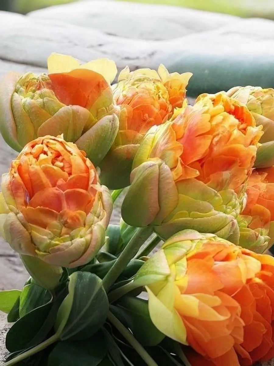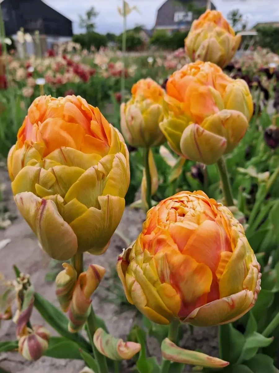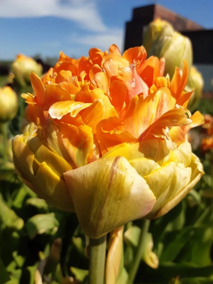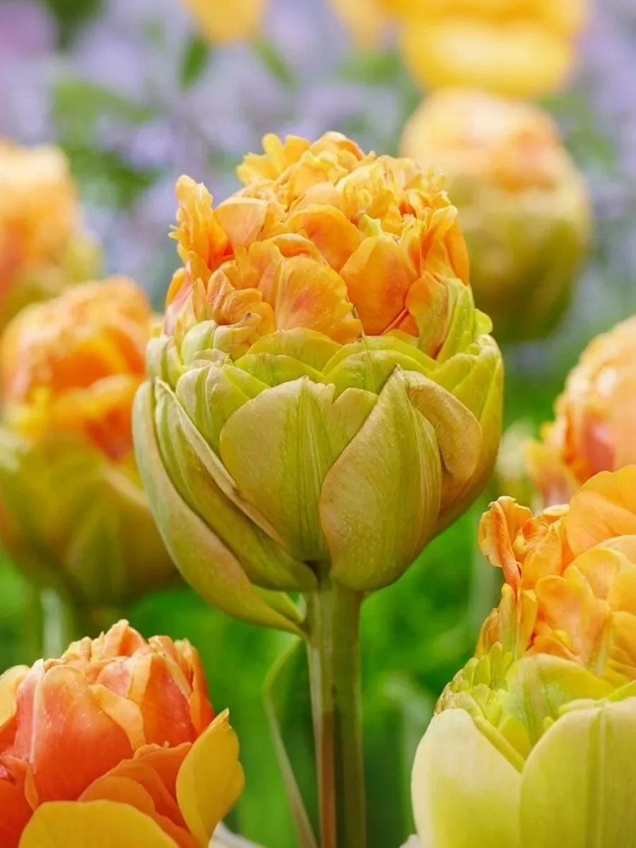 Тюльпан Ле-Лаванду относится к махровым ранним сортам. Формирует необычной формы нарядный бутон высотой 6-8 см. Нижняя часть бокала собрана из крупных лепестков салатового цвета, верхняя — из мелких оранжевых. По мере роспуска чаша становится похожей на яркий оранжевый пион. Высота до 60 см. Период цветения апрель-май.