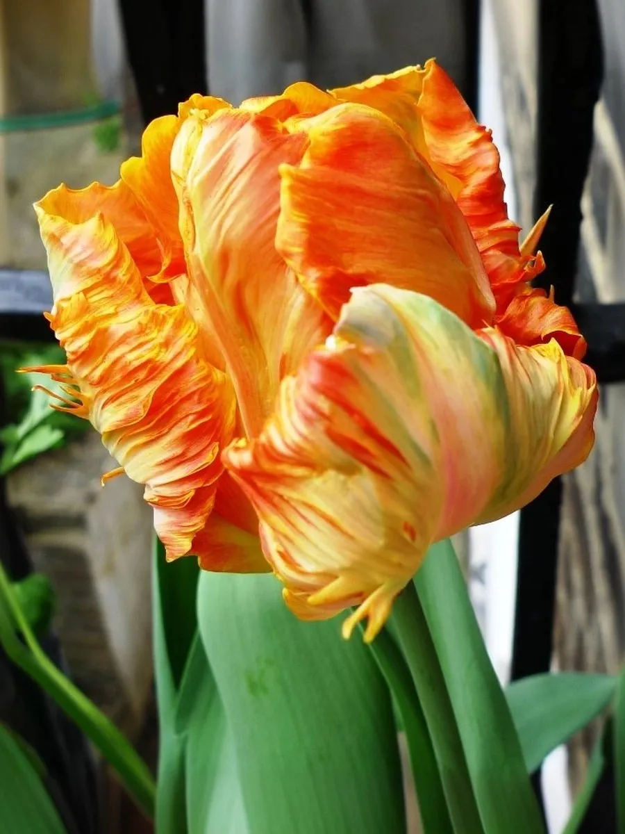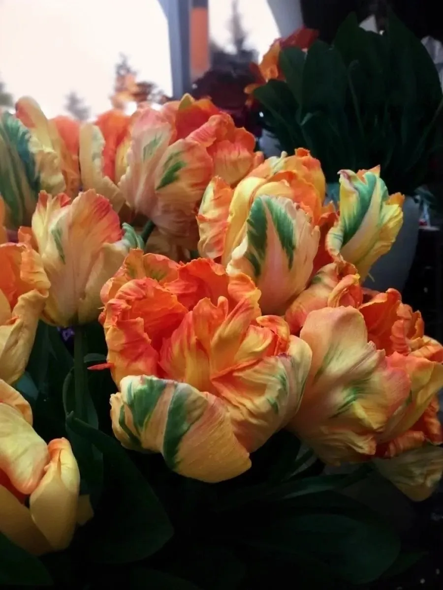 Тюльпан Пэррот Кинг попугайный бокал сильно гофрированный, соединяющий в своей окраске желто-алый с яркими всплесками зеленого по спинке лепестка, высота цветка около 9 см, в диаметре 15 см. Листва с серебристым отблеском завершает этот уникальный образ. Продолжительность цветения - до 2-3 недель.